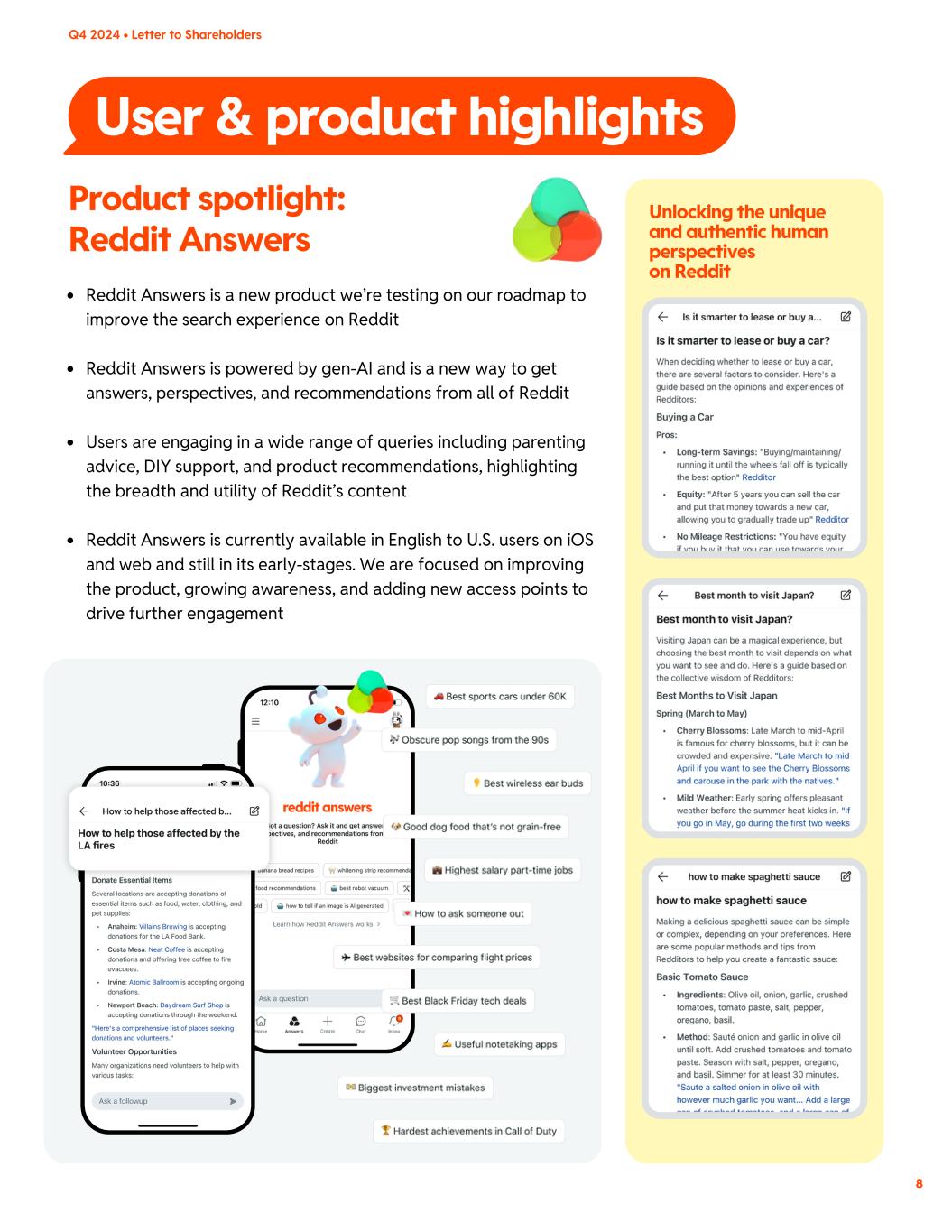 User & product highlights Product spotlight: Reddit Answers Reddit Answers is a new product we’re testing on our roadmap to improve the search experience on Reddit Reddit Answers is powered by gen-AI and is a new way to get answers, perspectives, and recommendations from all of Reddit Users are engaging in a wide range of queries including parenting advice, DIY support, and product recommendations, highlighting the breadth and utility of Reddit’s content Reddit Answers is currently available in English to U.S. users on iOS and web and still in its early-stages. We are focused on improving the product, growing awareness, and adding new access points to drive further engagement Unlocking the unique and authentic human perspectives on Reddit 8 Q4 2024 • Letter to Shareholders