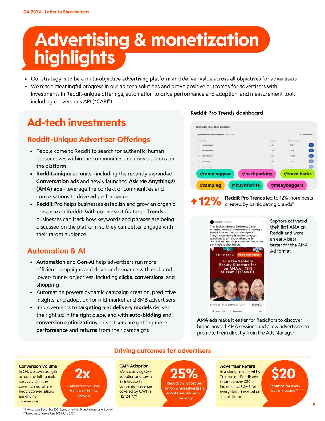 Advertising & monetization highlights 9 Reddit Pro Trends led to 12% more posts created by participating brands*12% 2x Conversion volume H2 ‘24 vs. H1 ‘24 growth Q4 2024 • Letter to Shareholders Ad-tech investments Our strategy is to be a multi-objective advertising platform and deliver value across all objectives for advertisers We made meaningful progress in our ad tech solutions and drove positive outcomes for advertisers with investments in Reddit-unique offerings, automation to drive performance and adoption, and measurement tools including conversions API (“CAPI”) Conversion Volume In Q4, we saw strength across the full-funnel, particularly in the lower funnel, where Reddit conversations are driving conversions 25% Reduction in cost per action when advertisers adopt CAPI + Pixel vs. Pixel only CAPI Adoption We are driving CAPI adoption and saw a 3x increase in conversion revenue covered by CAPI in H2 '24 Y/Y $20 Returned for every dollar invested** Advertiser Return In a study conducted by Transunion, Reddit ads returned over $20 in incremental ROAS for every dollar invested on the platform Driving outcomes for advertisers People come to Reddit to search for authentic, human perspectives within the communities and conversations on the platform Reddit-unique ad units - including the recently expanded Conversation ads and newly launched Ask Me Anything® (AMA) ads - leverage the context of communities and conversations to drive ad performance Reddit Pro helps businesses establish and grow an organic presence on Reddit. With our newest feature - Trends - businesses can track how keywords and phrases are being discussed on the platform so they can better engage with their target audience Reddit-Unique Advertiser Offerings Reddit Pro Trends dashboard Automation and Gen-AI help advertisers run more efficient campaigns and drive performance with mid- and lower- funnel objectives, including clicks, conversions, and shopping Automation powers dynamic campaign creation, predictive insights, and adoption for mid-market and SMB advertisers Improvements to targeting and delivery models deliver the right ad in the right place, and with auto-bidding and conversion optimizations, advertisers are getting more performance and returns from their campaigns Automation & AI AMA ads make it easier for Redditors to discover brand-hosted AMA sessions and allow advertisers to promote them directly from the Ads Manager * Internal data, December 2024 based on initial 2.5 week measurement period ** Based on data from June 2023-June 2024. Sephora activated their first AMA on Reddit and were an early beta tester for the AMA Ad format