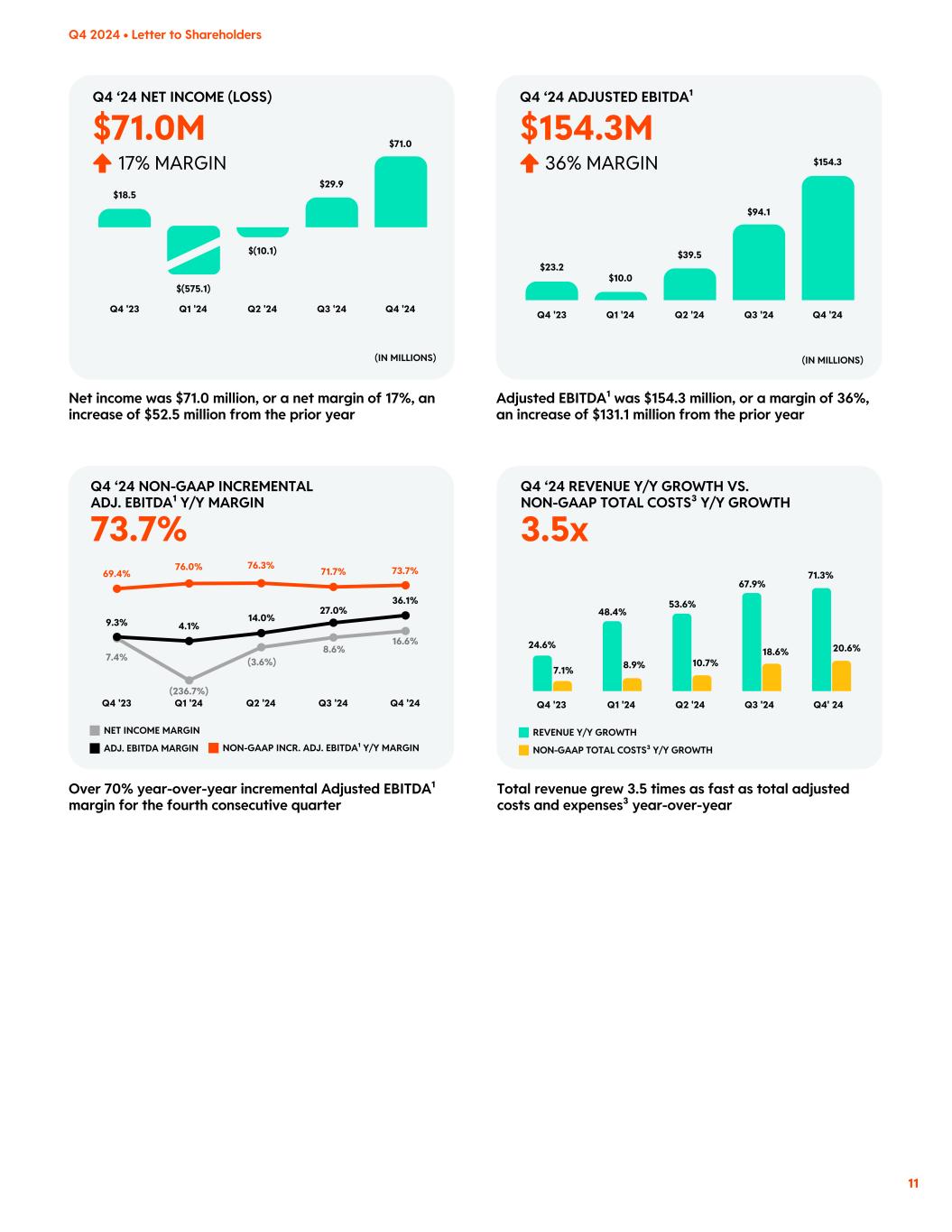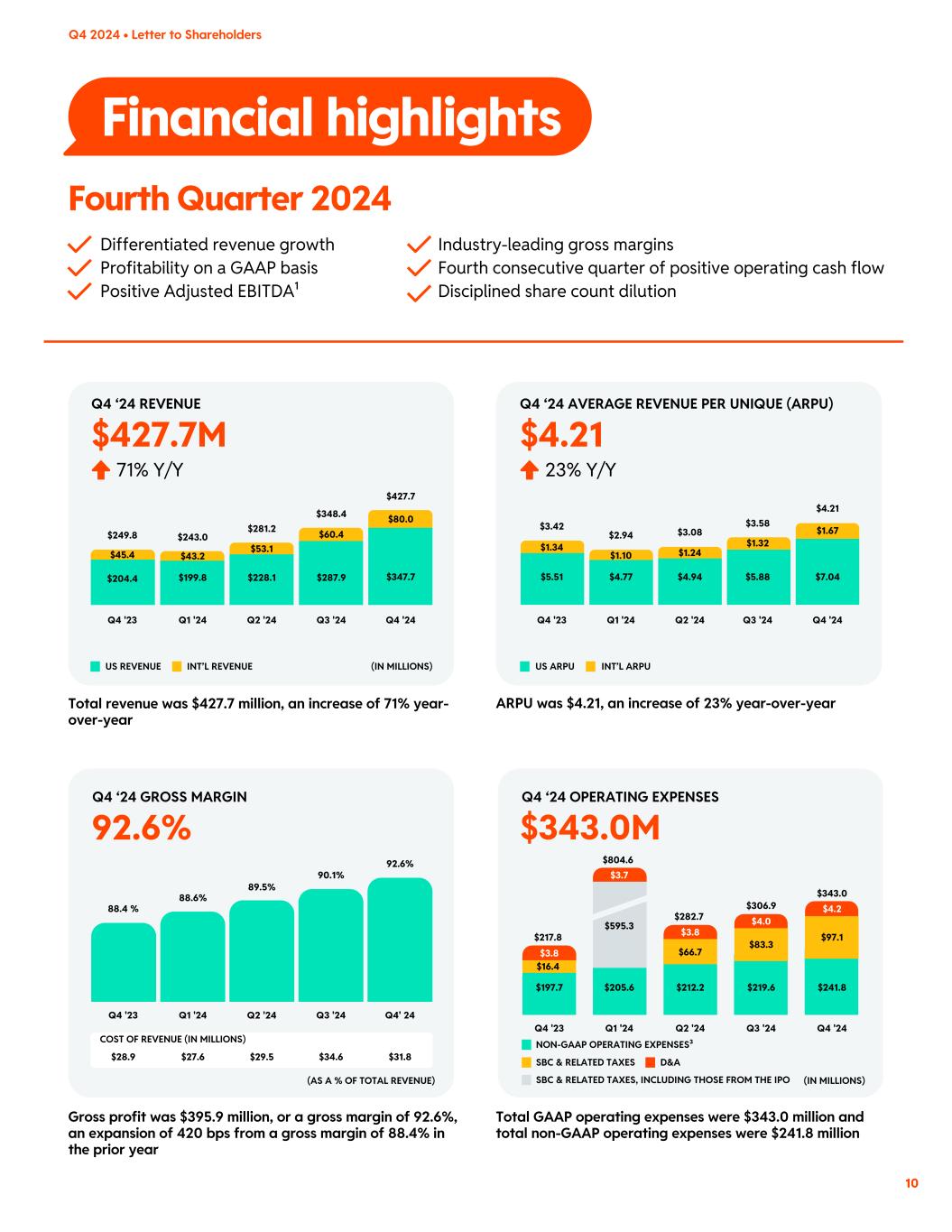 Financial highlights Differentiated revenue growth Profitability on a GAAP basis Positive Adjusted EBITDA¹ $427.7M Q4 ‘24 REVENUE 71% Y/Y $4.21 Q4 ‘24 AVERAGE REVENUE PER UNIQUE (ARPU) 23% Y/Y SBC & RELATED TAXES NON-GAAP OPERATING EXPENSES³ SBC & RELATED TAXES, INCLUDING THOSE FROM THE IPO D&A Fourth Quarter 2024 Q4 2024 • Letter to Shareholders 10 Industry-leading gross margins Fourth consecutive quarter of positive operating cash flow Disciplined share count dilution US REVENUE (IN MILLIONS)INT’L REVENUE $281.2 $228.1 $53.1 $348.4 $287.9 $60.4 $427.7 $347.7 $80.0 $249.8 $204.4 $45.4 $243.0 $199.8 $43.2 Q1 '24 Q2 '24 Q3 '24 Q4 '24Q4 '23 Total revenue was $427.7 million, an increase of 71% year- over-year US ARPU INT’L ARPU $3.08 $3.58 $4.21 $3.42 $2.94 Q1 '24 Q2 '24 Q3 '24 Q4 '24Q4 '23 $4.94 $7.04$5.51 $4.77 $5.88 $1.24 $1.67 $1.34 $1.10 $1.32 ARPU was $4.21, an increase of 23% year-over-year 92.6% Q4 ‘24 GROSS MARGIN 88.4 % 88.6% 89.5% 90.1% 92.6% (AS A % OF TOTAL REVENUE) COST OF REVENUE (IN MILLIONS) Q1 '24 $27.6 Q2 '24 $29.5 Q3 '24 $34.6 Q4' 24 $31.8 Q4 '23 $28.9 Gross profit was $395.9 million, or a gross margin of 92.6%, an expansion of 420 bps from a gross margin of 88.4% in the prior year Total GAAP operating expenses were $343.0 million and total non-GAAP operating expenses were $241.8 million Q4 ‘24 OPERATING EXPENSES (IN MILLIONS) Q1 '24 Q2 '24 Q3 '24 Q4 '24Q4 '23 $217.8 $804.6 $3.8 $3.7 $4.2 $4.0 $3.8 $197.7 $16.4 $205.6 $595.3 $212.2 $219.6 $241.8 $97.1 $83.3 $343.0 $306.9 $282.7 $66.7 $343.0M