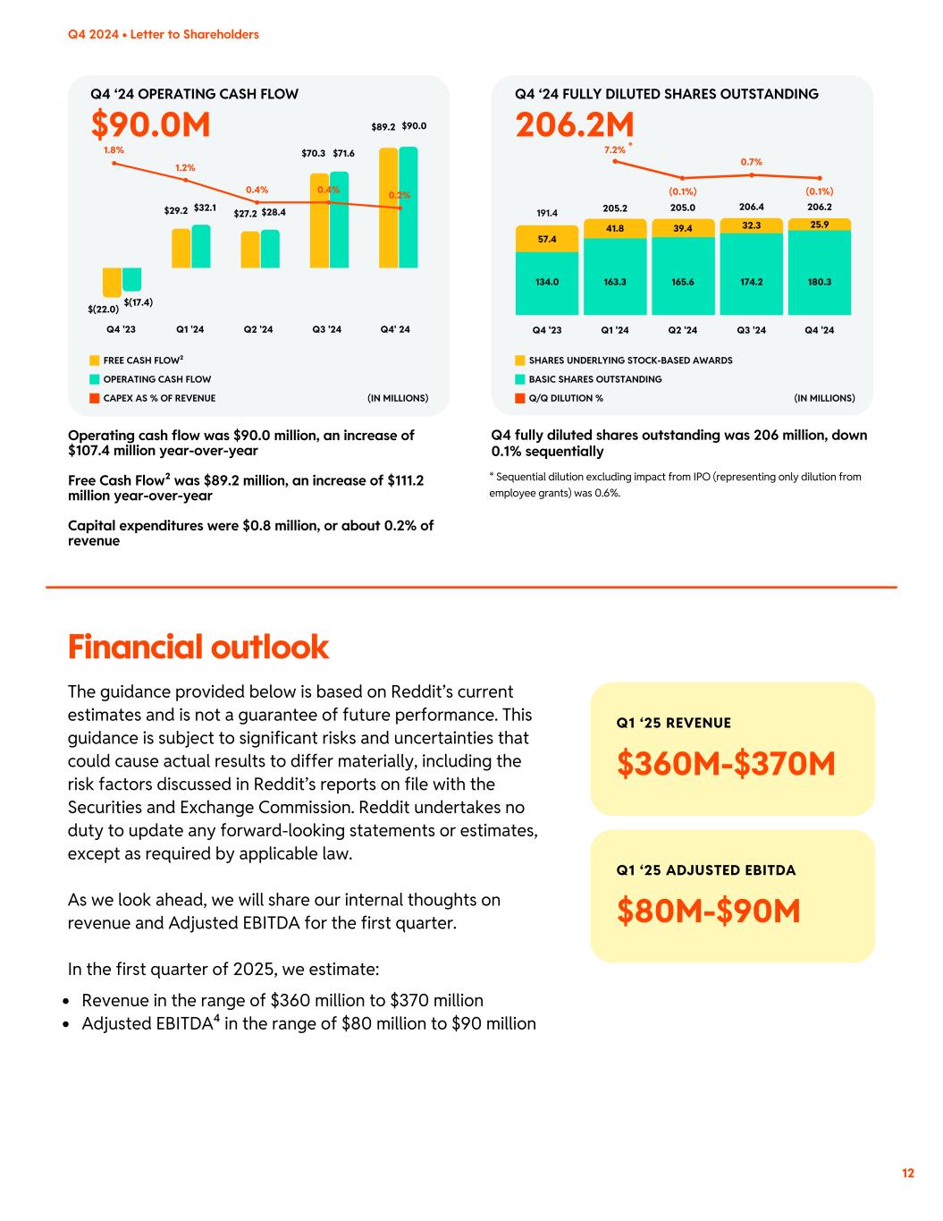 BASIC SHARES OUTSTANDING SHARES UNDERLYING STOCK-BASED AWARDS Q/Q DILUTION % Q1 ‘25 REVENUE $360M-$370M Q1 ‘25 ADJUSTED EBITDA $80M-$90M Q4 2024 • Letter to Shareholders 12 $29.2 $27.2 1.8% 1.2% 0.4% 0.4% 0.2% $70.3 $32.1 $89.2 $(22.0) $(17.4) $28.4 $71.6 $90.0 Q1 '24 Q2 '24 Q3 '24 Q4' 24Q4 '23 Operating cash flow was $90.0 million, an increase of $107.4 million year-over-year Free Cash Flow² was $89.2 million, an increase of $111.2 million year-over-year Capital expenditures were $0.8 million, or about 0.2% of revenue Q4 ‘24 OPERATING CASH FLOW OPERATING CASH FLOW FREE CASH FLOW² (IN MILLIONS)CAPEX AS % OF REVENUE 0.7% 206.2M$90.0M Q4 ‘24 FULLY DILUTED SHARES OUTSTANDING 205.0 206.4 206.2191.4 * 205.2 Q1 '24 Q2 '24 Q3 '24 Q4 '24Q4 '23 165.6 180.3134.0 163.3 174.2 39.4 25.9 57.4 41.8 32.3 (0.1%) 7.2% (0.1%) (IN MILLIONS) Q4 fully diluted shares outstanding was 206 million, down 0.1% sequentially The guidance provided below is based on Reddit’s current estimates and is not a guarantee of future performance. This guidance is subject to significant risks and uncertainties that could cause actual results to differ materially, including the risk factors discussed in Reddit’s reports on file with the Securities and Exchange Commission. Reddit undertakes no duty to update any forward-looking statements or estimates, except as required by applicable law. As we look ahead, we will share our internal thoughts on revenue and Adjusted EBITDA for the first quarter. In the first quarter of 2025, we estimate: Revenue in the range of $360 million to $370 million Adjusted EBITDA⁴ in the range of $80 million to $90 million Financial outlook * Sequential dilution excluding impact from IPO (representing only dilution from employee grants) was 0.6%.