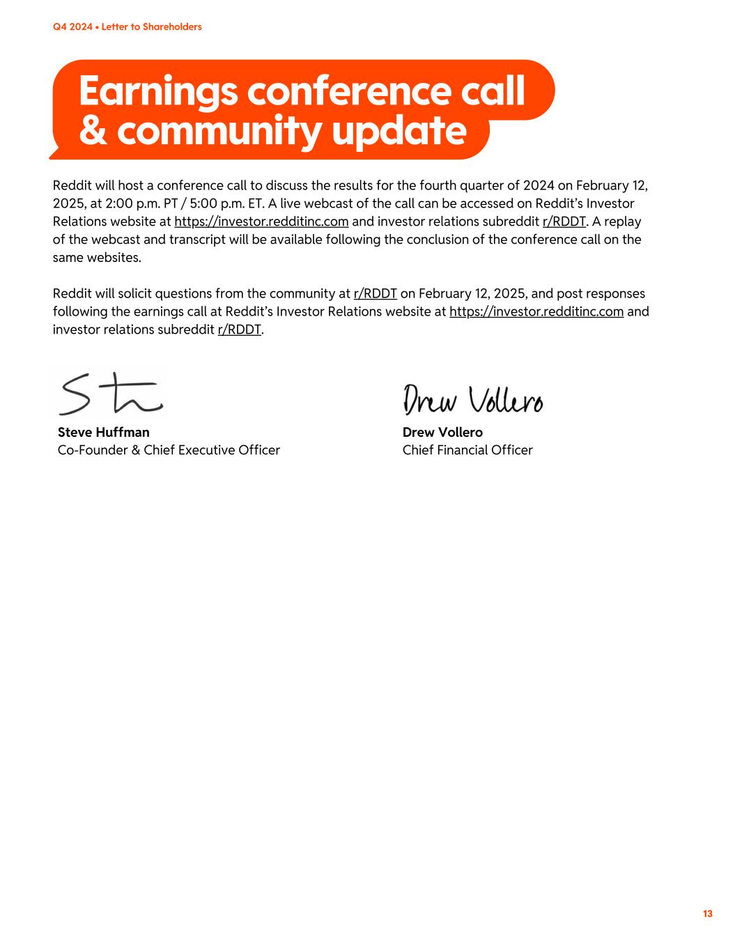Reddit will host a conference call to discuss the results for the fourth quarter of 2024 on February 12, 2025, at 2:00 p.m. PT / 5:00 p.m. ET. A live webcast of the call can be accessed on Reddit’s Investor Relations website at https://investor.redditinc.com and investor relations subreddit r/RDDT. A replay of the webcast and transcript will be available following the conclusion of the conference call on the same websites. Reddit will solicit questions from the community at r/RDDT on February 12, 2025, and post responses following the earnings call at Reddit’s Investor Relations website at https://investor.redditinc.com and investor relations subreddit r/RDDT. Steve Huffman Co-Founder & Chief Executive Officer Drew Vollero Chief Financial Officer Q4 2024 • Letter to Shareholders Earnings conference call & community update 13