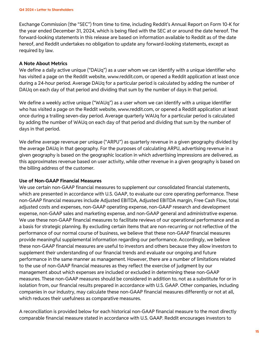 Exchange Commission (the “SEC”) from time to time, including Reddit’s Annual Report on Form 10-K for the year ended December 31, 2024, which is being filed with the SEC at or around the date hereof. The forward-looking statements in this release are based on information available to Reddit as of the date hereof, and Reddit undertakes no obligation to update any forward-looking statements, except as required by law. A Note About Metrics We define a daily active unique (“DAUq”) as a user whom we can identify with a unique identifier who has visited a page on the Reddit website, www.reddit.com, or opened a Reddit application at least once during a 24-hour period. Average DAUq for a particular period is calculated by adding the number of DAUq on each day of that period and dividing that sum by the number of days in that period. We define a weekly active unique (“WAUq”) as a user whom we can identify with a unique identifier who has visited a page on the Reddit website, www.reddit.com, or opened a Reddit application at least once during a trailing seven-day period. Average quarterly WAUq for a particular period is calculated by adding the number of WAUq on each day of that period and dividing that sum by the number of days in that period. We define average revenue per unique (“ARPU”) as quarterly revenue in a given geography divided by the average DAUq in that geography. For the purposes of calculating ARPU, advertising revenue in a given geography is based on the geographic location in which advertising impressions are delivered, as this approximates revenue based on user activity, while other revenue in a given geography is based on the billing address of the customer. Use of Non-GAAP Financial Measures We use certain non-GAAP financial measures to supplement our consolidated financial statements, which are presented in accordance with U.S. GAAP, to evaluate our core operating performance. These non-GAAP financial measures include Adjusted EBITDA, Adjusted EBITDA margin, Free Cash Flow, total adjusted costs and expenses, non-GAAP operating expense, non-GAAP research and development expense, non-GAAP sales and marketing expense, and non-GAAP general and administrative expense. We use these non-GAAP financial measures to facilitate reviews of our operational performance and as a basis for strategic planning. By excluding certain items that are non-recurring or not reflective of the performance of our normal course of business, we believe that these non-GAAP financial measures provide meaningful supplemental information regarding our performance. Accordingly, we believe these non-GAAP financial measures are useful to investors and others because they allow investors to supplement their understanding of our financial trends and evaluate our ongoing and future performance in the same manner as management. However, there are a number of limitations related to the use of non-GAAP financial measures as they reflect the exercise of judgment by our management about which expenses are included or excluded in determining these non-GAAP measures. These non-GAAP measures should be considered in addition to, not as a substitute for or in isolation from, our financial results prepared in accordance with U.S. GAAP. Other companies, including companies in our industry, may calculate these non-GAAP financial measures differently or not at all, which reduces their usefulness as comparative measures. A reconciliation is provided below for each historical non-GAAP financial measure to the most directly comparable financial measure stated in accordance with U.S. GAAP. Reddit encourages investors to 15 Q4 2024 • Letter to Shareholders