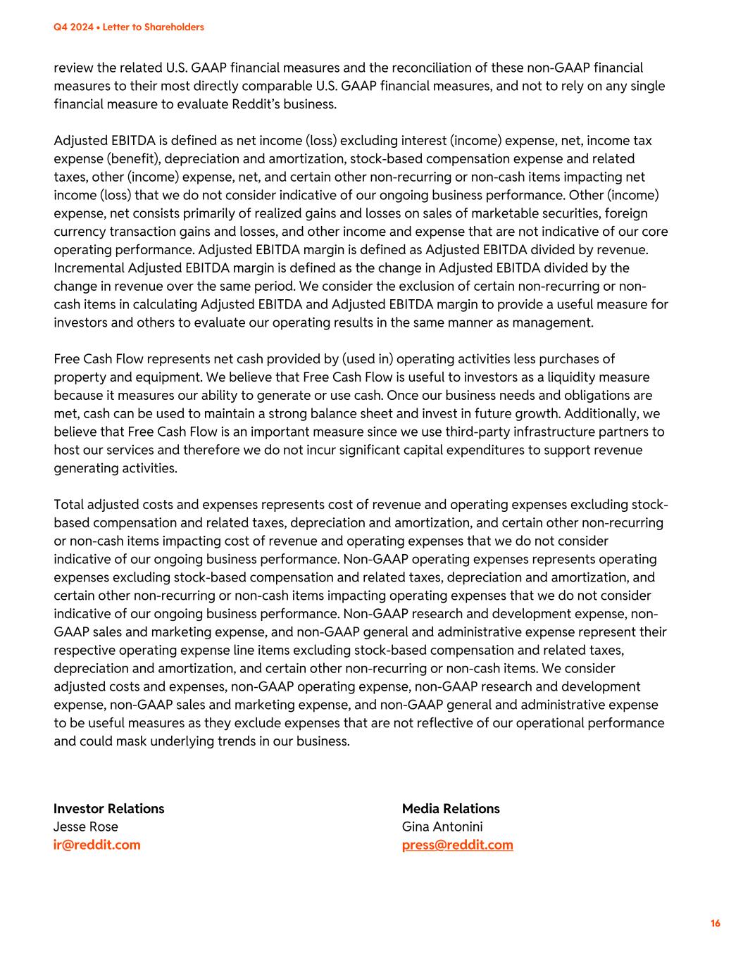 review the related U.S. GAAP financial measures and the reconciliation of these non-GAAP financial measures to their most directly comparable U.S. GAAP financial measures, and not to rely on any single financial measure to evaluate Reddit’s business. Adjusted EBITDA is defined as net income (loss) excluding interest (income) expense, net, income tax expense (benefit), depreciation and amortization, stock-based compensation expense and related taxes, other (income) expense, net, and certain other non-recurring or non-cash items impacting net income (loss) that we do not consider indicative of our ongoing business performance. Other (income) expense, net consists primarily of realized gains and losses on sales of marketable securities, foreign currency transaction gains and losses, and other income and expense that are not indicative of our core operating performance. Adjusted EBITDA margin is defined as Adjusted EBITDA divided by revenue. Incremental Adjusted EBITDA margin is defined as the change in Adjusted EBITDA divided by the change in revenue over the same period. We consider the exclusion of certain non-recurring or non- cash items in calculating Adjusted EBITDA and Adjusted EBITDA margin to provide a useful measure for investors and others to evaluate our operating results in the same manner as management. Free Cash Flow represents net cash provided by (used in) operating activities less purchases of property and equipment. We believe that Free Cash Flow is useful to investors as a liquidity measure because it measures our ability to generate or use cash. Once our business needs and obligations are met, cash can be used to maintain a strong balance sheet and invest in future growth. Additionally, we believe that Free Cash Flow is an important measure since we use third-party infrastructure partners to host our services and therefore we do not incur significant capital expenditures to support revenue generating activities. Total adjusted costs and expenses represents cost of revenue and operating expenses excluding stock- based compensation and related taxes, depreciation and amortization, and certain other non-recurring or non-cash items impacting cost of revenue and operating expenses that we do not consider indicative of our ongoing business performance. Non-GAAP operating expenses represents operating expenses excluding stock-based compensation and related taxes, depreciation and amortization, and certain other non-recurring or non-cash items impacting operating expenses that we do not consider indicative of our ongoing business performance. Non-GAAP research and development expense, non- GAAP sales and marketing expense, and non-GAAP general and administrative expense represent their respective operating expense line items excluding stock-based compensation and related taxes, depreciation and amortization, and certain other non-recurring or non-cash items. We consider adjusted costs and expenses, non-GAAP operating expense, non-GAAP research and development expense, non-GAAP sales and marketing expense, and non-GAAP general and administrative expense to be useful measures as they exclude expenses that are not reflective of our operational performance and could mask underlying trends in our business. Investor Relations Jesse Rose ir@reddit.com Media Relations Gina Antonini press@reddit.com 16 Q4 2024 • Letter to Shareholders