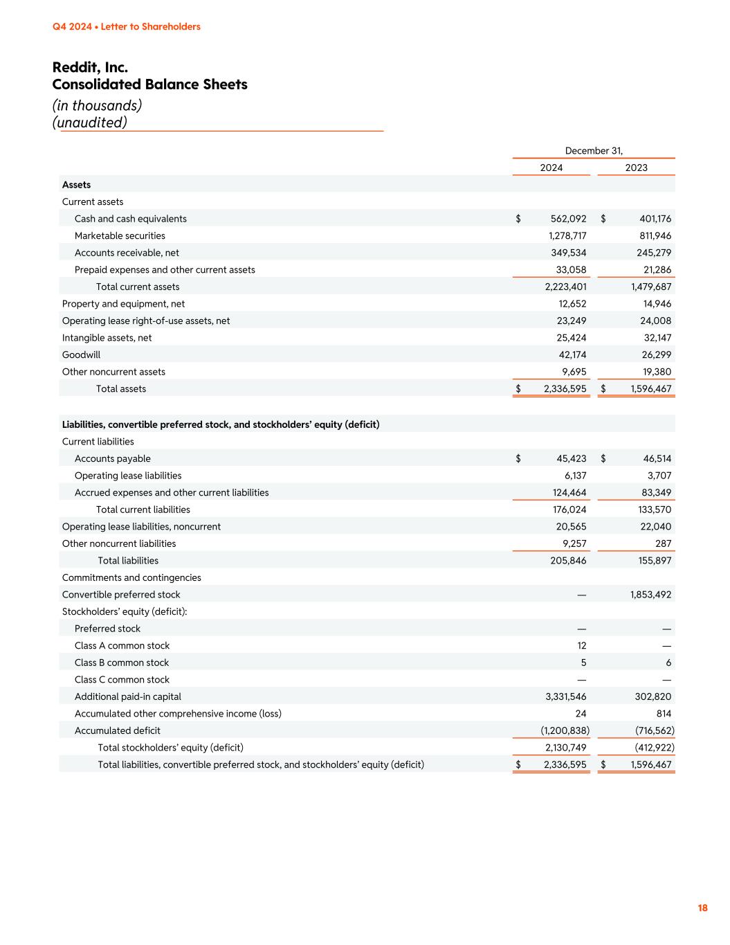 Reddit, Inc. Consolidated Balance Sheets (in thousands) (unaudited) 18 Q4 2024 • Letter to Shareholders December 31, 2024 2023 Assets Current assets Cash and cash equivalents $ 562,092 $ 401,176 Marketable securities 1,278,717 811,946 Accounts receivable, net 349,534 245,279 Prepaid expenses and other current assets 33,058 21,286 Total current assets 2,223,401 1,479,687 Property and equipment, net 12,652 14,946 Operating lease right-of-use assets, net 23,249 24,008 Intangible assets, net 25,424 32,147 Goodwill 42,174 26,299 Other noncurrent assets 9,695 19,380 Total assets $ 2,336,595 $ 1,596,467 Liabilities, convertible preferred stock, and stockholders’ equity (deficit) Current liabilities Accounts payable $ 45,423 $ 46,514 Operating lease liabilities 6,137 3,707 Accrued expenses and other current liabilities 124,464 83,349 Total current liabilities 176,024 133,570 Operating lease liabilities, noncurrent 20,565 22,040 Other noncurrent liabilities 9,257 287 Total liabilities 205,846 155,897 Commitments and contingencies Convertible preferred stock — 1,853,492 Stockholders’ equity (deficit): Preferred stock — — Class A common stock 12 — Class B common stock 5 6 Class C common stock — — Additional paid-in capital 3,331,546 302,820 Accumulated other comprehensive income (loss) 24 814 Accumulated deficit (1,200,838) (716,562) Total stockholders’ equity (deficit) 2,130,749 (412,922) Total liabilities, convertible preferred stock, and stockholders’ equity (deficit) $ 2,336,595 $ 1,596,467