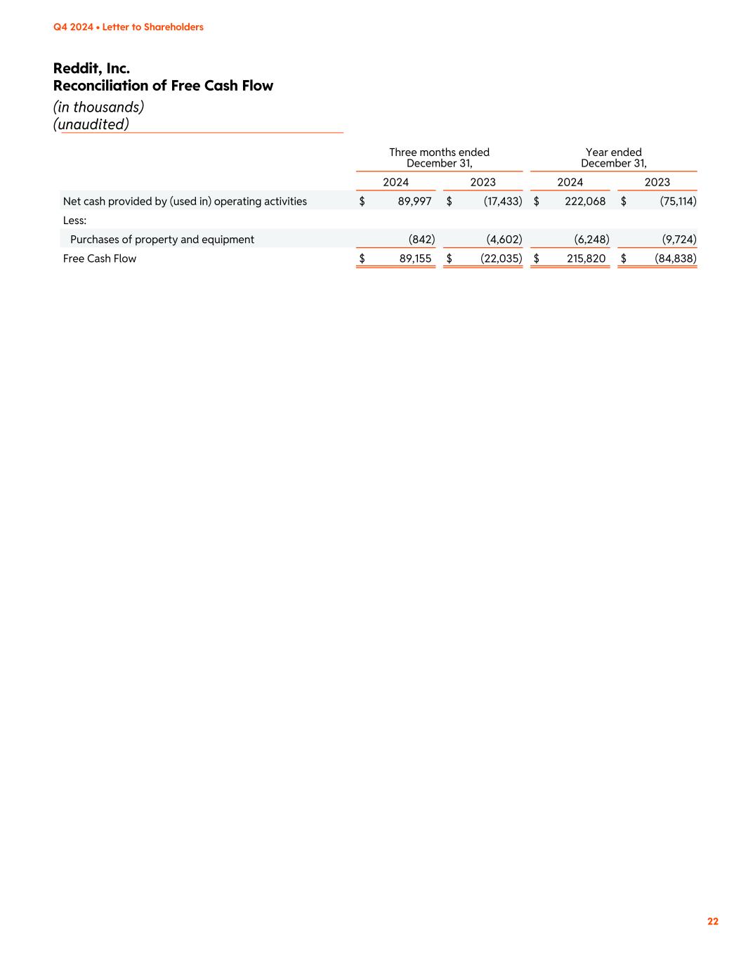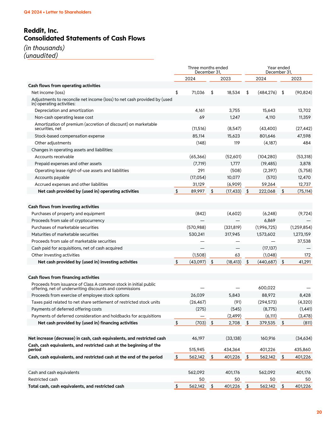 Reddit, Inc. Consolidated Statements of Cash Flows (in thousands) (unaudited) 20 Q4 2024 • Letter to Shareholders Three months ended December 31, Year ended December 31, 2024 2023 2024 2023 Cash flows from operating activities Net income (loss) $ 71,036 $ 18,534 $ (484,276) $ (90,824) Adjustments to reconcile net income (loss) to net cash provided by (used in) operating activities: Depreciation and amortization 4,161 3,755 15,643 13,702 Non-cash operating lease cost 69 1,247 4,110 11,359 Amortization of premium (accretion of discount) on marketable securities, net (11,516) (8,547) (43,400) (27,442) Stock-based compensation expense 85,114 15,623 801,646 47,598 Other adjustments (148) 119 (4,187) 484 Changes in operating assets and liabilities: Accounts receivable (65,366) (52,601) (104,280) (53,318) Prepaid expenses and other assets (7,719) 1,777 (19,485) 3,878 Operating lease right-of-use assets and liabilities 291 (508) (2,397) (5,758) Accounts payable (17,054) 10,077 (570) 12,470 Accrued expenses and other liabilities 31,129 (6,909) 59,264 12,737 Net cash provided by (used in) operating activities $ 89,997 $ (17,433) $ 222,068 $ (75,114) Cash flows from investing activities Purchases of property and equipment (842) (4,602) (6,248) (9,724) Proceeds from sale of cryptocurrency — — 6,869 — Purchases of marketable securities (570,988) (331,819) (1,996,725) (1,259,854) Maturities of marketable securities 530,241 317,945 1,573,602 1,273,159 Proceeds from sale of marketable securities — — — 37,538 Cash paid for acquisitions, net of cash acquired — — (17,137) — Other investing activities (1,508) 63 (1,048) 172 Net cash provided by (used in) investing activities $ (43,097) $ (18,413) $ (440,687) $ 41,291 Cash flows from financing activities Proceeds from issuance of Class A common stock in initial public offering, net of underwriting discounts and commissions — — 600,022 — Proceeds from exercise of employee stock options 26,039 5,843 88,972 8,428 Taxes paid related to net share settlement of restricted stock units (26,467) (91) (294,573) (4,320) Payments of deferred offering costs (275) (545) (8,775) (1,441) Payments of deferred consideration and holdbacks for acquisitions — (2,499) (6,111) (3,478) Net cash provided by (used in) financing activities $ (703) $ 2,708 $ 379,535 $ (811) Net increase (decrease) in cash, cash equivalents, and restricted cash 46,197 (33,138) 160,916 (34,634) Cash, cash equivalents, and restricted cash at the beginning of the period 515,945 434,364 401,226 435,860 Cash, cash equivalents, and restricted cash at the end of the period $ 562,142 $ 401,226 $ 562,142 $ 401,226 Cash and cash equivalents 562,092 401,176 562,092 401,176 Restricted cash 50 50 50 50 Total cash, cash equivalents, and restricted cash $ 562,142 $ 401,226 $ 562,142 $ 401,226