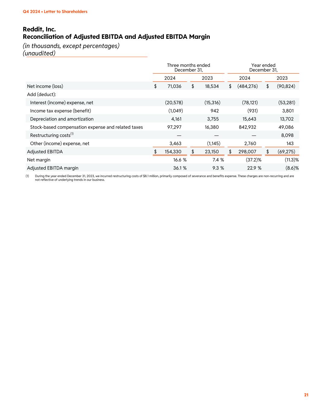 Reddit, Inc. Reconciliation of Adjusted EBITDA and Adjusted EBITDA Margin (in thousands, except percentages) (unaudited) 21 Q4 2024 • Letter to Shareholders Three months ended December 31, Year ended December 31, 2024 2023 2024 2023 Net income (loss) $ 71,036 $ 18,534 $ (484,276) $ (90,824) Add (deduct): Interest (income) expense, net (20,578) (15,316) (78,121) (53,281) Income tax expense (benefit) (1,049) 942 (931) 3,801 Depreciation and amortization 4,161 3,755 15,643 13,702 Stock-based compensation expense and related taxes 97,297 16,380 842,932 49,086 Restructuring costs(1) — — — 8,098 Other (income) expense, net 3,463 (1,145) 2,760 143 Adjusted EBITDA $ 154,330 $ 23,150 $ 298,007 $ (69,275) Net margin 16.6 % 7.4 % (37.2) % (11.3) % Adjusted EBITDA margin 36.1 % 9.3 % 22.9 % (8.6) % (1) During the year ended December 31, 2023, we incurred restructuring costs of $8.1 million, primarily composed of severance and benefits expense. These charges are non-recurring and are not reflective of underlying trends in our business.