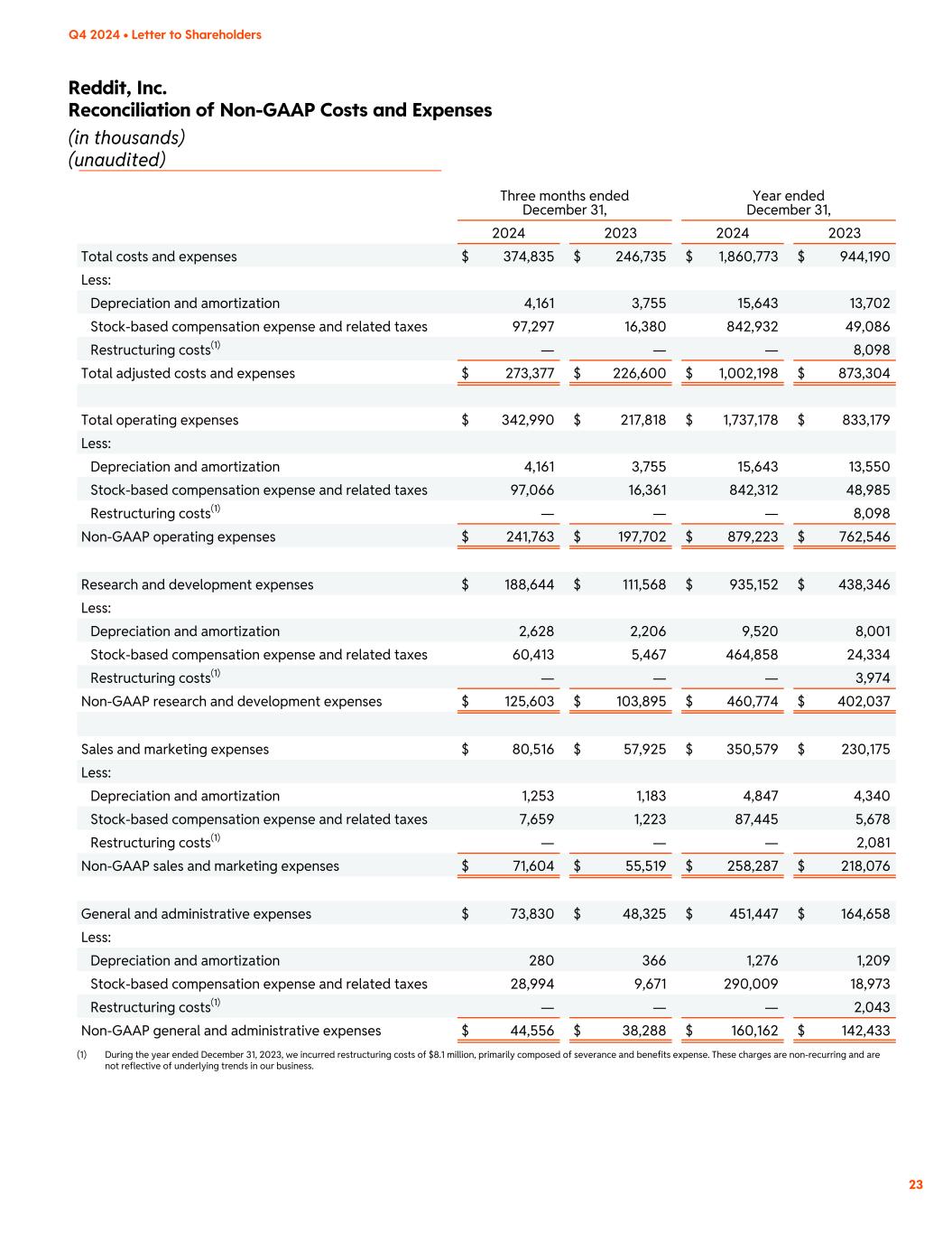 Reddit, Inc. Reconciliation of Non-GAAP Costs and Expenses (in thousands) (unaudited) 23 Q4 2024 • Letter to Shareholders Three months ended December 31, Year ended December 31, 2024 2023 2024 2023 Total costs and expenses $ 374,835 $ 246,735 $ 1,860,773 $ 944,190 Less: Depreciation and amortization 4,161 3,755 15,643 13,702 Stock-based compensation expense and related taxes 97,297 16,380 842,932 49,086 Restructuring costs(1) — — — 8,098 Total adjusted costs and expenses $ 273,377 $ 226,600 $ 1,002,198 $ 873,304 Total operating expenses $ 342,990 $ 217,818 $ 1,737,178 $ 833,179 Less: Depreciation and amortization 4,161 3,755 15,643 13,550 Stock-based compensation expense and related taxes 97,066 16,361 842,312 48,985 Restructuring costs(1) — — — 8,098 Non-GAAP operating expenses $ 241,763 $ 197,702 $ 879,223 $ 762,546 Research and development expenses $ 188,644 $ 111,568 $ 935,152 $ 438,346 Less: Depreciation and amortization 2,628 2,206 9,520 8,001 Stock-based compensation expense and related taxes 60,413 5,467 464,858 24,334 Restructuring costs(1) — — — 3,974 Non-GAAP research and development expenses $ 125,603 $ 103,895 $ 460,774 $ 402,037 Sales and marketing expenses $ 80,516 $ 57,925 $ 350,579 $ 230,175 Less: Depreciation and amortization 1,253 1,183 4,847 4,340 Stock-based compensation expense and related taxes 7,659 1,223 87,445 5,678 Restructuring costs(1) — — — 2,081 Non-GAAP sales and marketing expenses $ 71,604 $ 55,519 $ 258,287 $ 218,076 General and administrative expenses $ 73,830 $ 48,325 $ 451,447 $ 164,658 Less: Depreciation and amortization 280 366 1,276 1,209 Stock-based compensation expense and related taxes 28,994 9,671 290,009 18,973 Restructuring costs(1) — — — 2,043 Non-GAAP general and administrative expenses $ 44,556 $ 38,288 $ 160,162 $ 142,433 (1) During the year ended December 31, 2023, we incurred restructuring costs of $8.1 million, primarily composed of severance and benefits expense. These charges are non-recurring and are not reflective of underlying trends in our business.