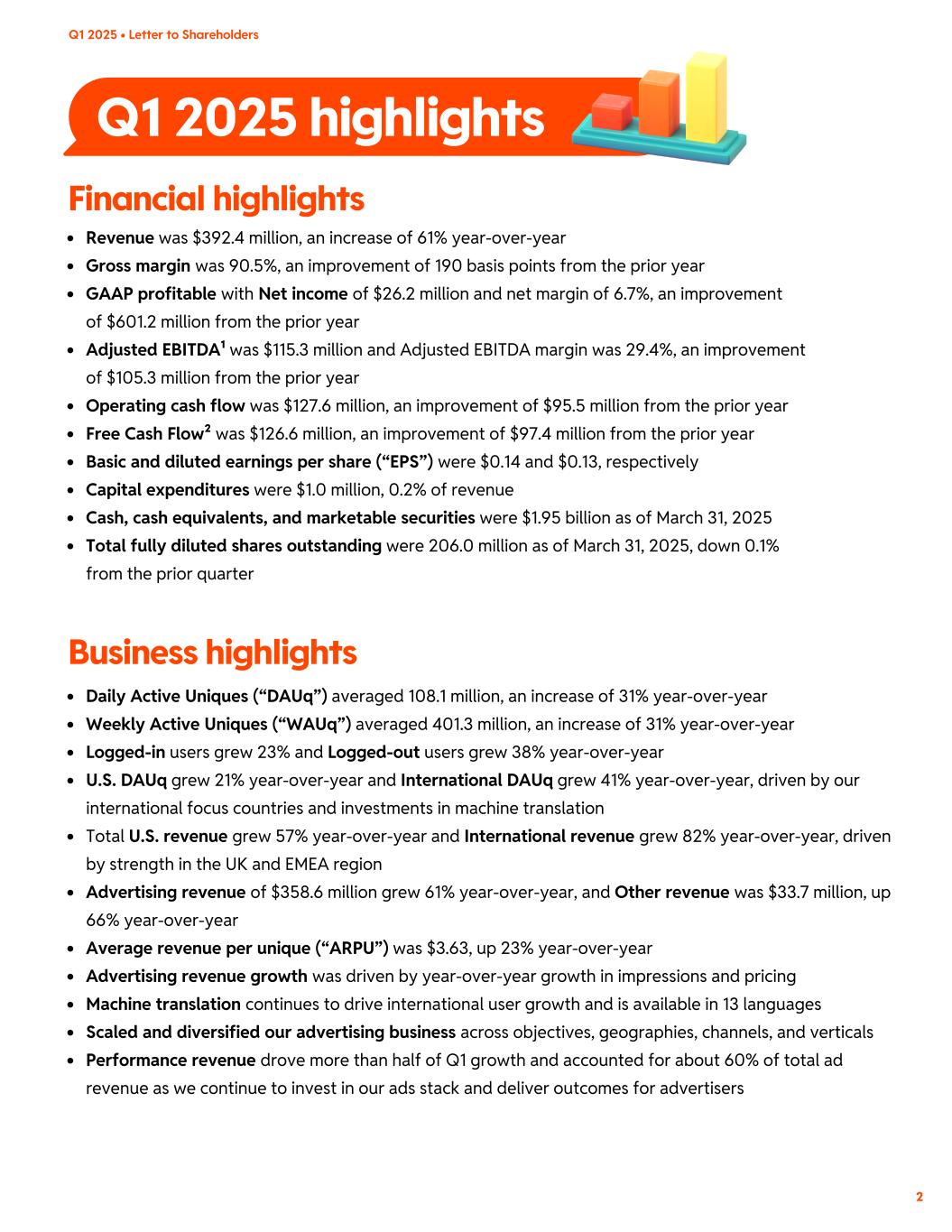 Q1 2025 highlights Revenue was $392.4 million, an increase of 61% year-over-year Gross margin was 90.5%, an improvement of 190 basis points from the prior year GAAP profitable with Net income of $26.2 million and net margin of 6.7%, an improvement of $601.2 million from the prior year Adjusted EBITDA¹ was $115.3 million and Adjusted EBITDA margin was 29.4%, an improvement of $105.3 million from the prior year Operating cash flow was $127.6 million, an improvement of $95.5 million from the prior year Free Cash Flow² was $126.6 million, an improvement of $97.4 million from the prior year Basic and diluted earnings per share (“EPS”) were $0.14 and $0.13, respectively Capital expenditures were $1.0 million, 0.2% of revenue Cash, cash equivalents, and marketable securities were $1.95 billion as of March 31, 2025 Total fully diluted shares outstanding were 206.0 million as of March 31, 2025, down 0.1% from the prior quarter Financial highlights 2 Q1 2025 • Letter to Shareholders Daily Active Uniques (“DAUq”) averaged 108.1 million, an increase of 31% year-over-year Weekly Active Uniques (“WAUq”) averaged 401.3 million, an increase of 31% year-over-year Logged-in users grew 23% and Logged-out users grew 38% year-over-year U.S. DAUq grew 21% year-over-year and International DAUq grew 41% year-over-year, driven by our international focus countries and investments in machine translation Total U.S. revenue grew 57% year-over-year and International revenue grew 82% year-over-year, driven by strength in the UK and EMEA region Advertising revenue of $358.6 million grew 61% year-over-year, and Other revenue was $33.7 million, up 66% year-over-year Average revenue per unique (“ARPU”) was $3.63, up 23% year-over-year Advertising revenue growth was driven by year-over-year growth in impressions and pricing Machine translation continues to drive international user growth and is available in 13 languages Scaled and diversified our advertising business across objectives, geographies, channels, and verticals Performance revenue drove more than half of Q1 growth and accounted for about 60% of total ad revenue as we continue to invest in our ads stack and deliver outcomes for advertisers Business highlights