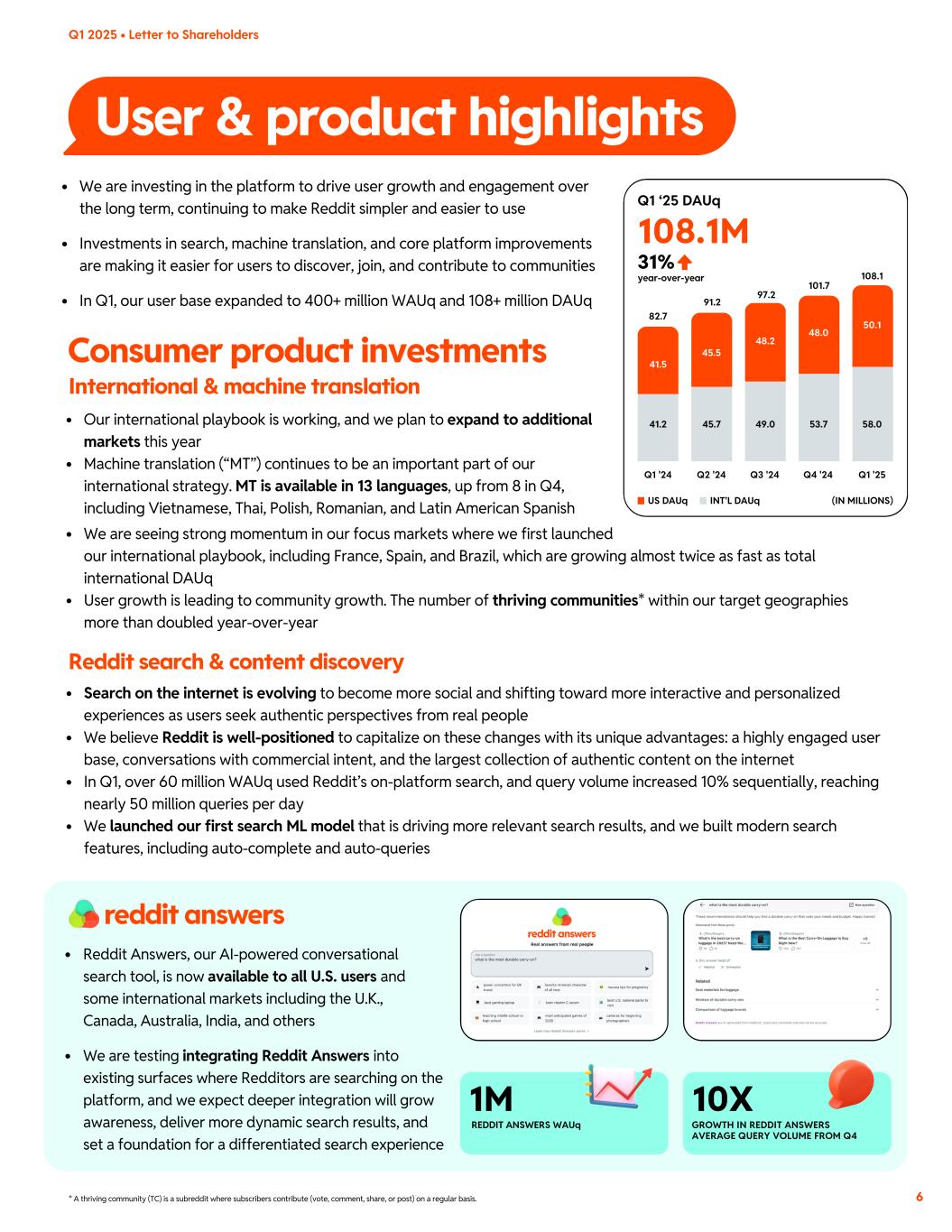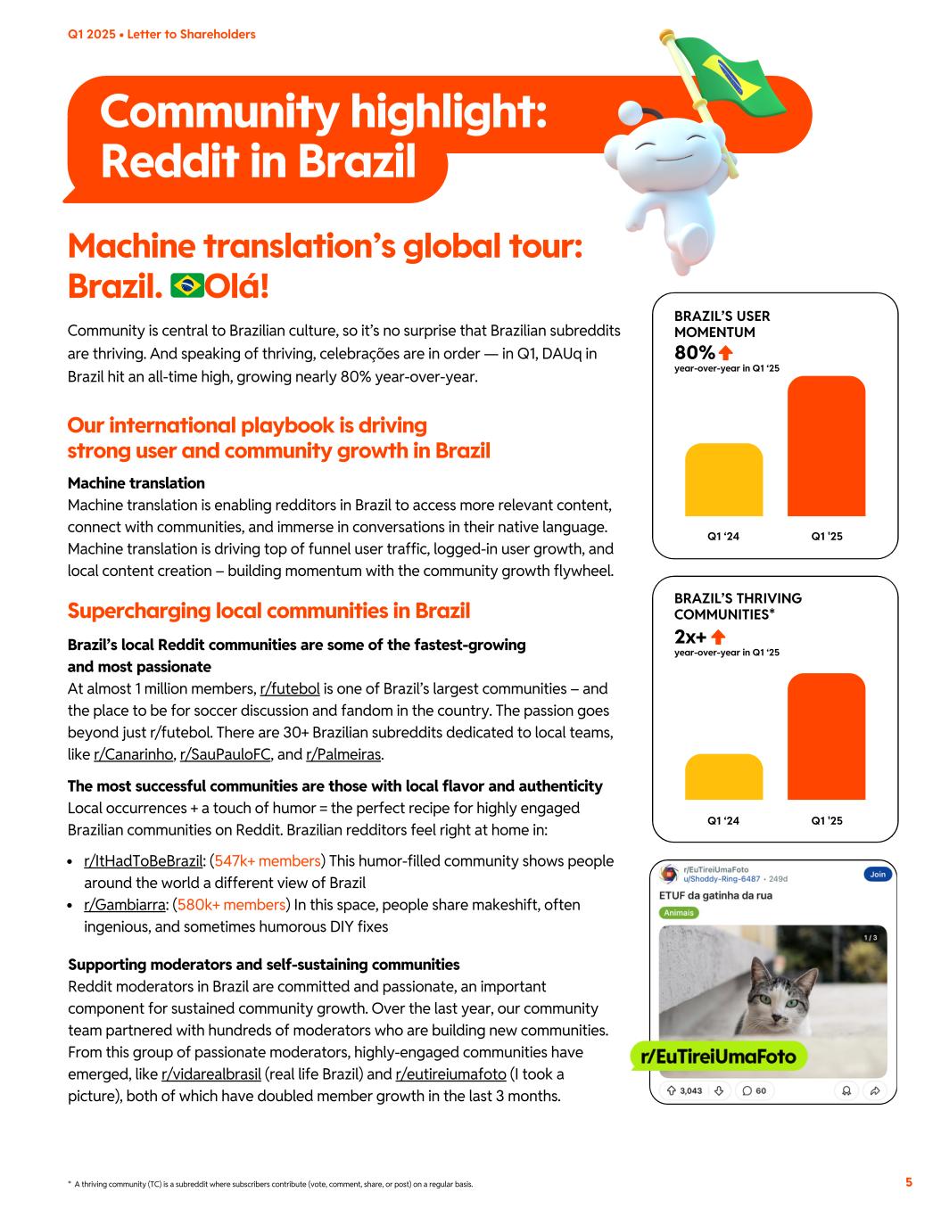 Community highlight: Reddit in Brazil Q1 2025 • Letter to Shareholders 80% 2x+ BRAZIL’S USER MOMENTUM year-over-year in Q1 ‘25 BRAZIL’S THRIVING COMMUNITIES* year-over-year in Q1 ‘25Brazil’s local Reddit communities are some of the fastest-growing and most passionate At almost 1 million members, r/futebol is one of Brazil’s largest communities – and the place to be for soccer discussion and fandom in the country. The passion goes beyond just r/futebol. There are 30+ Brazilian subreddits dedicated to local teams, like r/Canarinho, r/SauPauloFC, and r/Palmeiras. The most successful communities are those with local flavor and authenticity Local occurrences + a touch of humor = the perfect recipe for highly engaged Brazilian communities on Reddit. Brazilian redditors feel right at home in: r/ItHadToBeBrazil: (547k+ members) This humor-filled community shows people around the world a different view of Brazil r/Gambiarra: (580k+ members) In this space, people share makeshift, often ingenious, and sometimes humorous DIY fixes Machine translation Machine translation is enabling redditors in Brazil to access more relevant content, connect with communities, and immerse in conversations in their native language. Machine translation is driving top of funnel user traffic, logged-in user growth, and local content creation – building momentum with the community growth flywheel. Community is central to Brazilian culture, so it’s no surprise that Brazilian subreddits are thriving. And speaking of thriving, celebrações are in order — in Q1, DAUq in Brazil hit an all-time high, growing nearly 80% year-over-year. Supporting moderators and self-sustaining communities Reddit moderators in Brazil are committed and passionate, an important component for sustained community growth. Over the last year, our community team partnered with hundreds of moderators who are building new communities. From this group of passionate moderators, highly-engaged communities have emerged, like r/vidarealbrasil (real life Brazil) and r/eutireiumafoto (I took a picture), both of which have doubled member growth in the last 3 months. * A thriving community (TC) is a subreddit where subscribers contribute (vote, comment, share, or post) on a regular basis. 5 Machine translation’s global tour: Brazil. �Olá! Our international playbook is driving strong user and community growth in Brazil Supercharging local communities in Brazil Q1 ‘24 Q1 ‘24 Q1 '25 Q1 '25