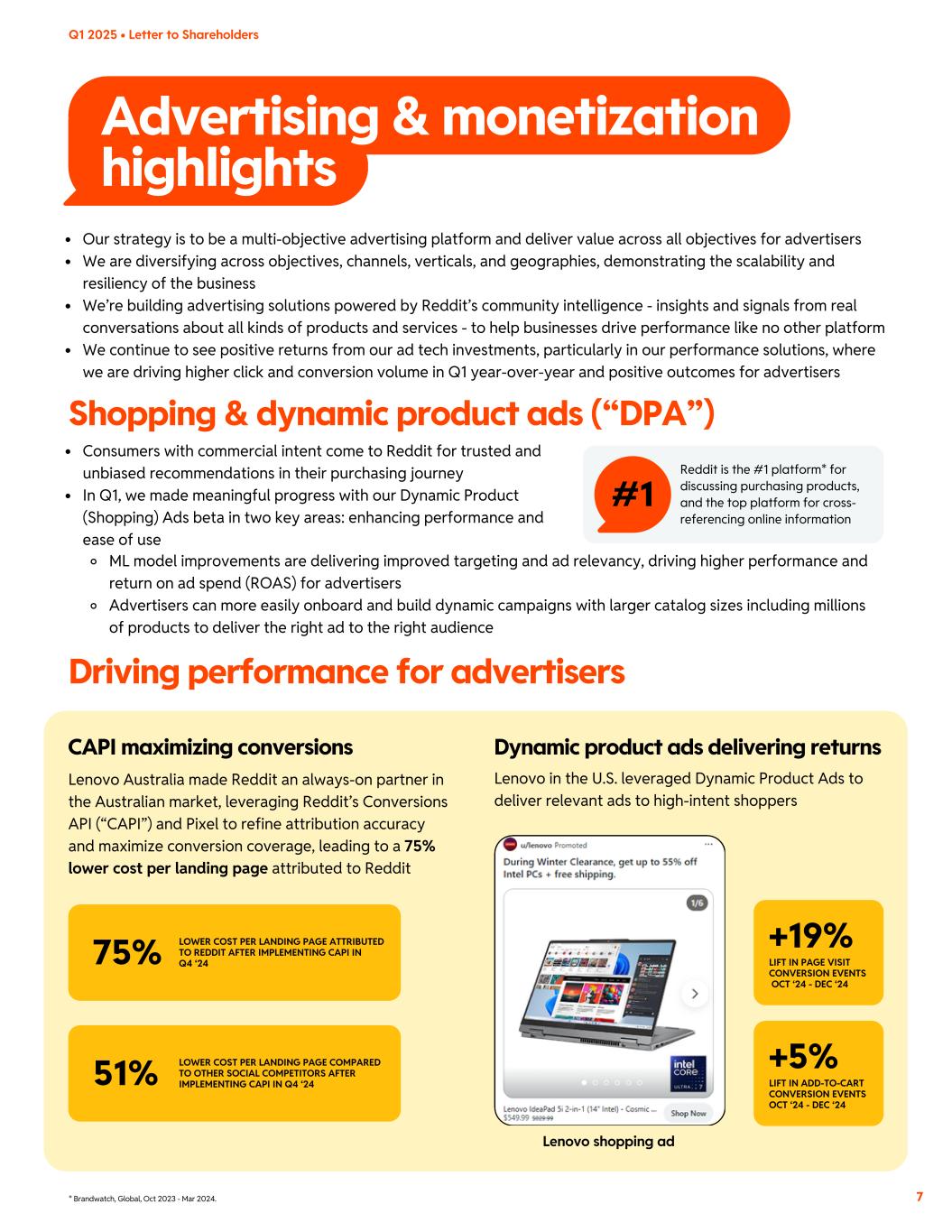 Advertising & monetization highlights #1 Reddit is the #1 platform* for discussing purchasing products, and the top platform for cross- referencing online information Driving performance for advertisers ML model improvements are delivering improved targeting and ad relevancy, driving higher performance and return on ad spend (ROAS) for advertisers Advertisers can more easily onboard and build dynamic campaigns with larger catalog sizes including millions of products to deliver the right ad to the right audience * Brandwatch, Global, Oct 2023 - Mar 2024. 7 Our strategy is to be a multi-objective advertising platform and deliver value across all objectives for advertisers We are diversifying across objectives, channels, verticals, and geographies, demonstrating the scalability and resiliency of the business We’re building advertising solutions powered by Reddit’s community intelligence - insights and signals from real conversations about all kinds of products and services - to help businesses drive performance like no other platform We continue to see positive returns from our ad tech investments, particularly in our performance solutions, where we are driving higher click and conversion volume in Q1 year-over-year and positive outcomes for advertisers Consumers with commercial intent come to Reddit for trusted and unbiased recommendations in their purchasing journey In Q1, we made meaningful progress with our Dynamic Product (Shopping) Ads beta in two key areas: enhancing performance and ease of use Q1 2025 • Letter to Shareholders Shopping & dynamic product ads (“DPA”) +19% LIFT IN PAGE VISIT CONVERSION EVENTS OCT ‘24 - DEC ‘24 75% LOWER COST PER LANDING PAGE ATTRIBUTED TO REDDIT AFTER IMPLEMENTING CAPI IN Q4 ‘24 +5% LIFT IN ADD-TO-CART CONVERSION EVENTS OCT ‘24 - DEC ‘24 51% LOWER COST PER LANDING PAGE COMPARED TO OTHER SOCIAL COMPETITORS AFTER IMPLEMENTING CAPI IN Q4 ‘24 CAPI maximizing conversions Dynamic product ads delivering returns Lenovo Australia made Reddit an always-on partner in the Australian market, leveraging Reddit’s Conversions API (“CAPI”) and Pixel to refine attribution accuracy and maximize conversion coverage, leading to a 75% lower cost per landing page attributed to Reddit Lenovo in the U.S. leveraged Dynamic Product Ads to deliver relevant ads to high-intent shoppers Lenovo shopping ad