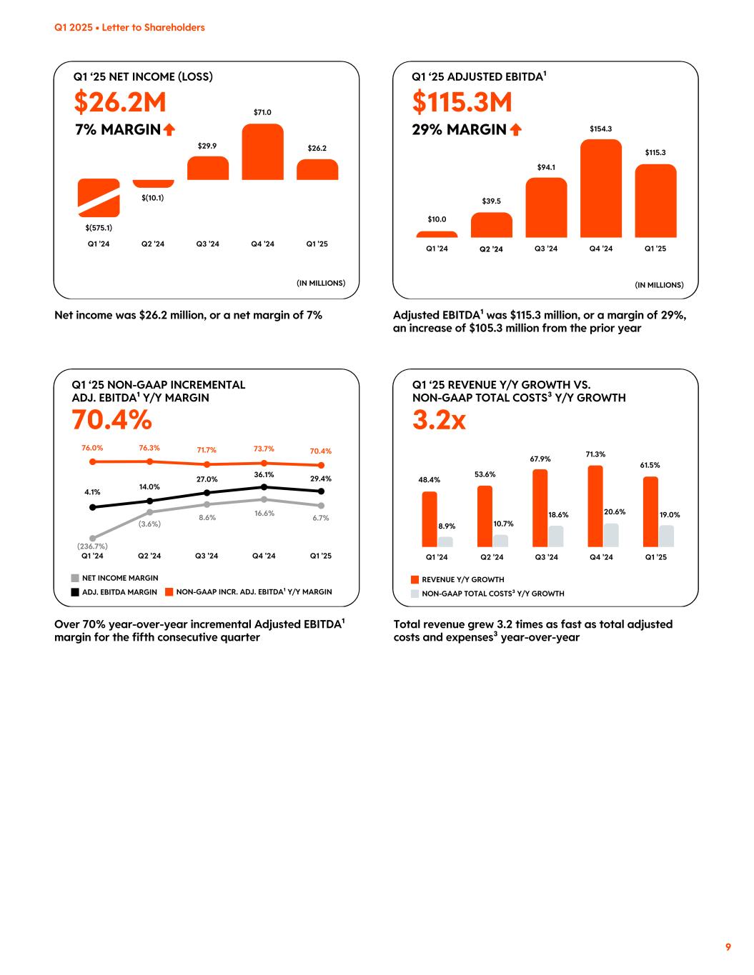 29% MARGIN7% MARGIN $115.3M 3.2x $26.2M 70.4% Q1 ‘25 NET INCOME (LOSS) Q2 '24 Q3 '24 Q4 '24 Q1 '25Q1 '24 (IN MILLIONS) Net income was $26.2 million, or a net margin of 7% $29.9 $26.2 $(575.1) $(10.1) $71.0 NON-GAAP TOTAL COSTS³ Y/Y GROWTH REVENUE Y/Y GROWTH Total revenue grew 3.2 times as fast as total adjusted costs and expenses³ year-over-year 48.4% 8.9% 53.6% 10.7% 67.9% 18.6% 71.3% 20.6% 61.5% 19.0% Q1 ‘25 REVENUE Y/Y GROWTH VS. NON-GAAP TOTAL COSTS³ Y/Y GROWTH Q2 '24 Q3 '24 Q4 '24 Q1 '25Q1 '24 Q1 ‘25 ADJUSTED EBITDA¹ Q2 '24 Q3 '24 Q4 '24 Q1 '25Q1 '24 (IN MILLIONS) Adjusted EBITDA¹ was $115.3 million, or a margin of 29%, an increase of $105.3 million from the prior year $10.0 $115.3 $39.5 $94.1 $154.3 Over 70% year-over-year incremental Adjusted EBITDA¹ margin for the fifth consecutive quarter 76.0% 4.1% 76.3% 14.0% (236.7%) (3.6%) 27.0% 8.6% 73.7% 36.1% 16.6% 71.7% 70.4% 29.4% 6.7% Q1 ‘25 NON-GAAP INCREMENTAL ADJ. EBITDA¹ Y/Y MARGIN NON-GAAP INCR. ADJ. EBITDA¹ Y/Y MARGIN NET INCOME MARGIN Q1 '25 ADJ. EBITDA MARGIN Q4 '24Q3 '24Q2 '24Q1 '24 Q1 2025 • Letter to Shareholders 9