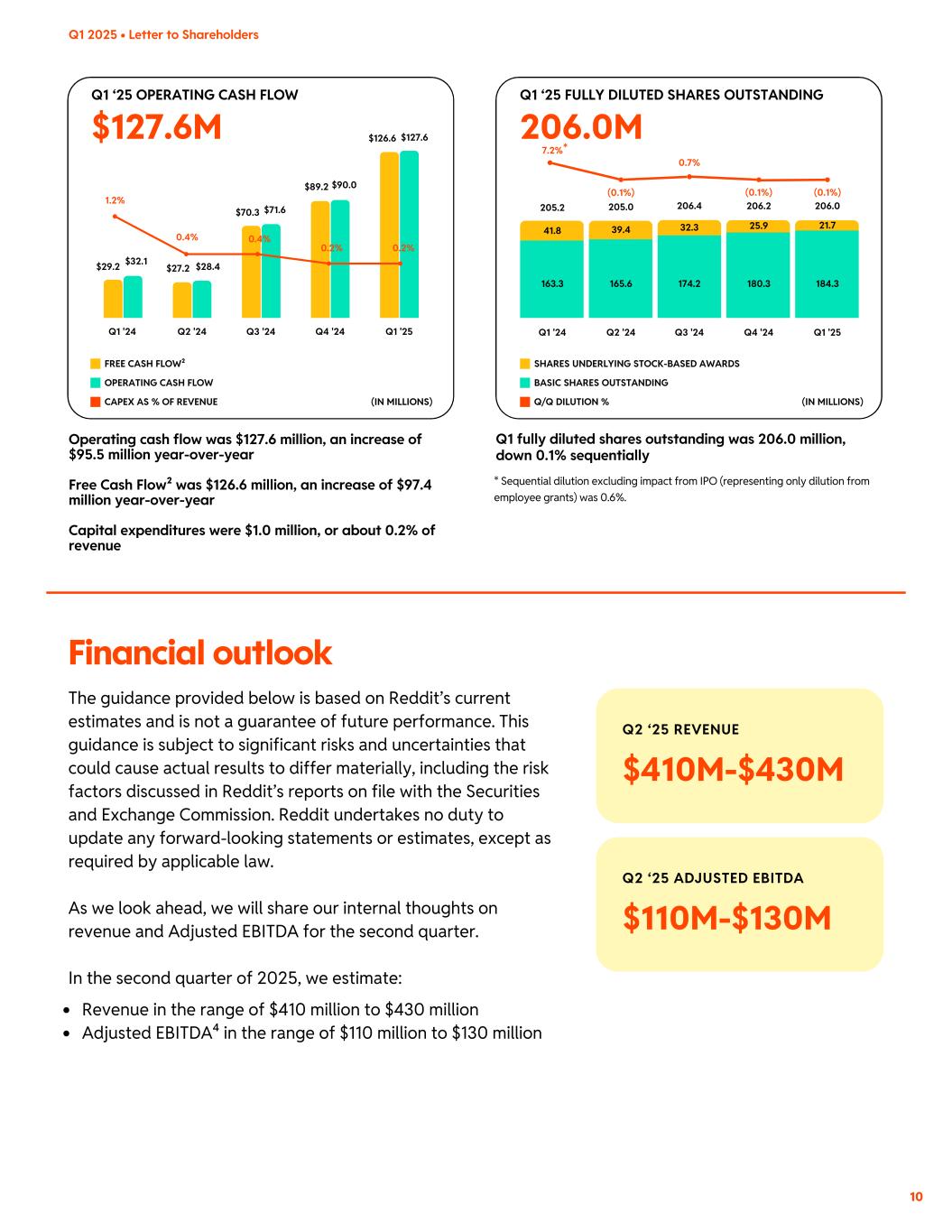 $127.6M Q2 ‘25 REVENUE $410M-$430M Q2 ‘25 ADJUSTED EBITDA $110M-$130M BASIC SHARES OUTSTANDING SHARES UNDERLYING STOCK-BASED AWARDS Q/Q DILUTION % $27.2 $70.3 1.2% 0.4% 0.4% 0.2% 0.2% $89.2 $126.6 $28.4$29.2 $32.1 $71.6 $90.0 $127.6 Q2 '24 Q3 '24 Q4 '24 Q1 '25Q1 '24 Operating cash flow was $127.6 million, an increase of $95.5 million year-over-year Free Cash Flow² was $126.6 million, an increase of $97.4 million year-over-year Capital expenditures were $1.0 million, or about 0.2% of revenue Q1 ‘25 OPERATING CASH FLOW OPERATING CASH FLOW FREE CASH FLOW² (IN MILLIONS)CAPEX AS % OF REVENUE 0.7% 206.0M Q1 ‘25 FULLY DILUTED SHARES OUTSTANDING 206.4 206.2 206.0205.2 * 205.0 Q2 '24 Q3 '24 Q4 '24 Q1 '25Q1 '24 174.2 184.3163.3 165.6 180.3 32.3 21.741.8 39.4 25.9 (0.1%) 7.2% (0.1%) (0.1%) (IN MILLIONS) Q1 fully diluted shares outstanding was 206.0 million, down 0.1% sequentially The guidance provided below is based on Reddit’s current estimates and is not a guarantee of future performance. This guidance is subject to significant risks and uncertainties that could cause actual results to differ materially, including the risk factors discussed in Reddit’s reports on file with the Securities and Exchange Commission. Reddit undertakes no duty to update any forward-looking statements or estimates, except as required by applicable law. As we look ahead, we will share our internal thoughts on revenue and Adjusted EBITDA for the second quarter. In the second quarter of 2025, we estimate: Revenue in the range of $410 million to $430 million Adjusted EBITDA⁴ in the range of $110 million to $130 million Financial outlook * Sequential dilution excluding impact from IPO (representing only dilution from employee grants) was 0.6%. Q1 2025 • Letter to Shareholders 10