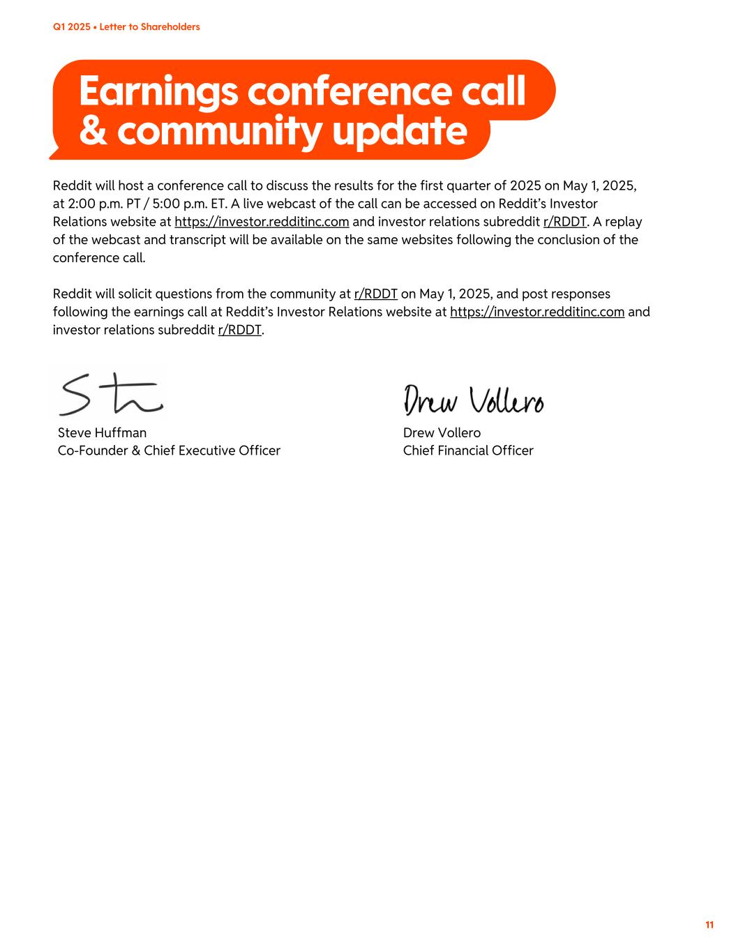 Reddit will host a conference call to discuss the results for the first quarter of 2025 on May 1, 2025, at 2:00 p.m. PT / 5:00 p.m. ET. A live webcast of the call can be accessed on Reddit’s Investor Relations website at https://investor.redditinc.com and investor relations subreddit r/RDDT. A replay of the webcast and transcript will be available on the same websites following the conclusion of the conference call. Reddit will solicit questions from the community at r/RDDT on May 1, 2025, and post responses following the earnings call at Reddit’s Investor Relations website at https://investor.redditinc.com and investor relations subreddit r/RDDT. Steve Huffman Co-Founder & Chief Executive Officer Drew Vollero Chief Financial Officer Earnings conference call & community update Q1 2025 • Letter to Shareholders 11