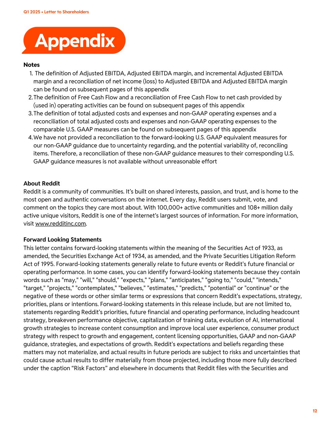 Appendix Notes The definition of Adjusted EBITDA, Adjusted EBITDA margin, and incremental Adjusted EBITDA margin and a reconciliation of net income (loss) to Adjusted EBITDA and Adjusted EBITDA margin can be found on subsequent pages of this appendix 1. The definition of Free Cash Flow and a reconciliation of Free Cash Flow to net cash provided by (used in) operating activities can be found on subsequent pages of this appendix 2. The definition of total adjusted costs and expenses and non-GAAP operating expenses and a reconciliation of total adjusted costs and expenses and non-GAAP operating expenses to the comparable U.S. GAAP measures can be found on subsequent pages of this appendix 3. We have not provided a reconciliation to the forward-looking U.S. GAAP equivalent measures for our non-GAAP guidance due to uncertainty regarding, and the potential variability of, reconciling items. Therefore, a reconciliation of these non-GAAP guidance measures to their corresponding U.S. GAAP guidance measures is not available without unreasonable effort 4. About Reddit Reddit is a community of communities. It’s built on shared interests, passion, and trust, and is home to the most open and authentic conversations on the internet. Every day, Reddit users submit, vote, and comment on the topics they care most about. With 100,000+ active communities and 108+ million daily active unique visitors, Reddit is one of the internet’s largest sources of information. For more information, visit www.redditinc.com. Forward Looking Statements This letter contains forward-looking statements within the meaning of the Securities Act of 1933, as amended, the Securities Exchange Act of 1934, as amended, and the Private Securities Litigation Reform Act of 1995. Forward-looking statements generally relate to future events or Reddit's future financial or operating performance. In some cases, you can identify forward-looking statements because they contain words such as "may," "will," "should," "expects," "plans," "anticipates," "going to," "could," "intends," "target," "projects," "contemplates," "believes," "estimates," "predicts," "potential" or "continue" or the negative of these words or other similar terms or expressions that concern Reddit's expectations, strategy, priorities, plans or intentions. Forward-looking statements in this release include, but are not limited to, statements regarding Reddit’s priorities, future financial and operating performance, including headcount strategy, breakeven performance objective, capitalization of training data, evolution of AI, international growth strategies to increase content consumption and improve local user experience, consumer product strategy with respect to growth and engagement, content licensing opportunities, GAAP and non-GAAP guidance, strategies, and expectations of growth. Reddit's expectations and beliefs regarding these matters may not materialize, and actual results in future periods are subject to risks and uncertainties that could cause actual results to differ materially from those projected, including those more fully described under the caption “Risk Factors” and elsewhere in documents that Reddit files with the Securities and Q1 2025 • Letter to Shareholders 12