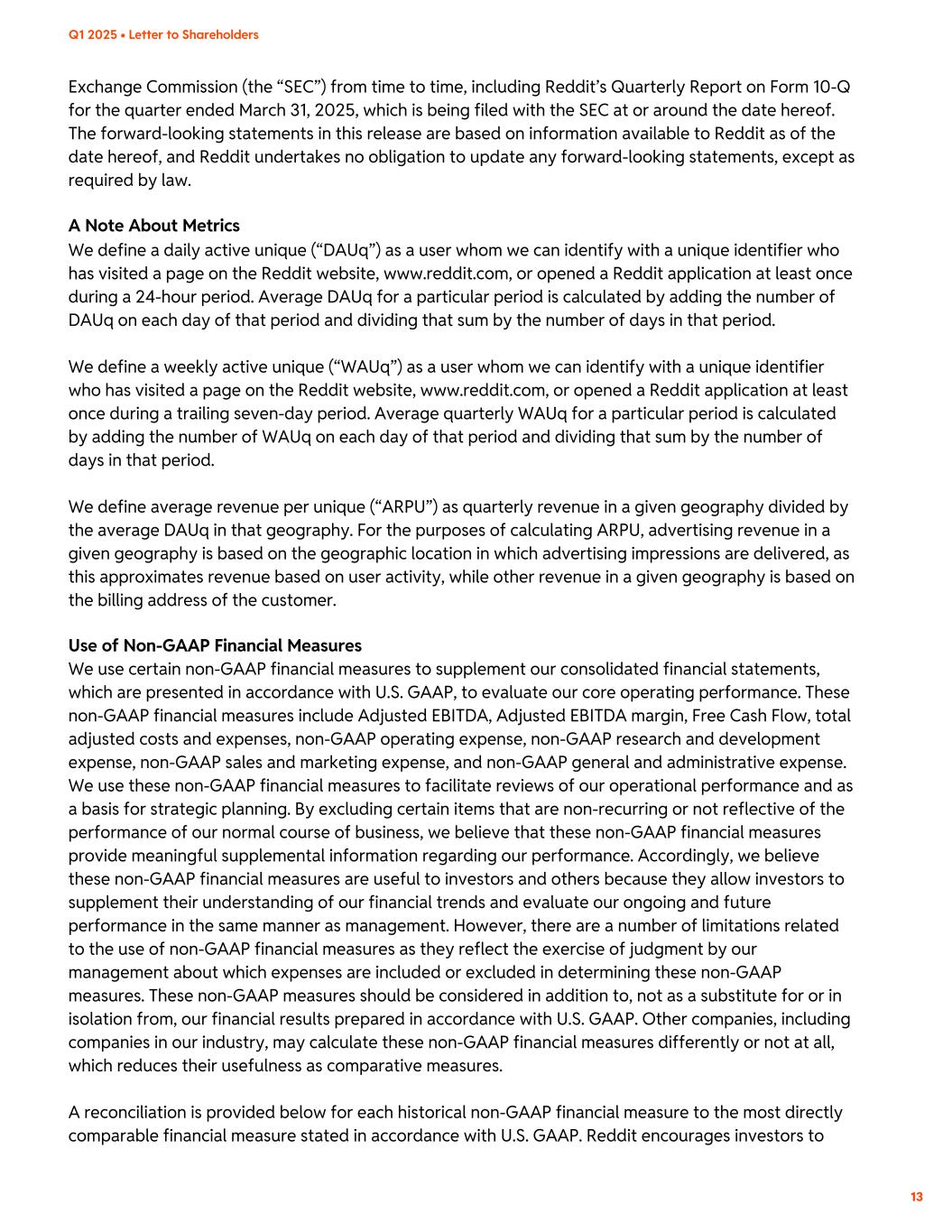 Exchange Commission (the “SEC”) from time to time, including Reddit’s Quarterly Report on Form 10-Q for the quarter ended March 31, 2025, which is being filed with the SEC at or around the date hereof. The forward-looking statements in this release are based on information available to Reddit as of the date hereof, and Reddit undertakes no obligation to update any forward-looking statements, except as required by law. A Note About Metrics We define a daily active unique (“DAUq”) as a user whom we can identify with a unique identifier who has visited a page on the Reddit website, www.reddit.com, or opened a Reddit application at least once during a 24-hour period. Average DAUq for a particular period is calculated by adding the number of DAUq on each day of that period and dividing that sum by the number of days in that period. We define a weekly active unique (“WAUq”) as a user whom we can identify with a unique identifier who has visited a page on the Reddit website, www.reddit.com, or opened a Reddit application at least once during a trailing seven-day period. Average quarterly WAUq for a particular period is calculated by adding the number of WAUq on each day of that period and dividing that sum by the number of days in that period. We define average revenue per unique (“ARPU”) as quarterly revenue in a given geography divided by the average DAUq in that geography. For the purposes of calculating ARPU, advertising revenue in a given geography is based on the geographic location in which advertising impressions are delivered, as this approximates revenue based on user activity, while other revenue in a given geography is based on the billing address of the customer. Use of Non-GAAP Financial Measures We use certain non-GAAP financial measures to supplement our consolidated financial statements, which are presented in accordance with U.S. GAAP, to evaluate our core operating performance. These non-GAAP financial measures include Adjusted EBITDA, Adjusted EBITDA margin, Free Cash Flow, total adjusted costs and expenses, non-GAAP operating expense, non-GAAP research and development expense, non-GAAP sales and marketing expense, and non-GAAP general and administrative expense. We use these non-GAAP financial measures to facilitate reviews of our operational performance and as a basis for strategic planning. By excluding certain items that are non-recurring or not reflective of the performance of our normal course of business, we believe that these non-GAAP financial measures provide meaningful supplemental information regarding our performance. Accordingly, we believe these non-GAAP financial measures are useful to investors and others because they allow investors to supplement their understanding of our financial trends and evaluate our ongoing and future performance in the same manner as management. However, there are a number of limitations related to the use of non-GAAP financial measures as they reflect the exercise of judgment by our management about which expenses are included or excluded in determining these non-GAAP measures. These non-GAAP measures should be considered in addition to, not as a substitute for or in isolation from, our financial results prepared in accordance with U.S. GAAP. Other companies, including companies in our industry, may calculate these non-GAAP financial measures differently or not at all, which reduces their usefulness as comparative measures. A reconciliation is provided below for each historical non-GAAP financial measure to the most directly comparable financial measure stated in accordance with U.S. GAAP. Reddit encourages investors to Q1 2025 • Letter to Shareholders 13