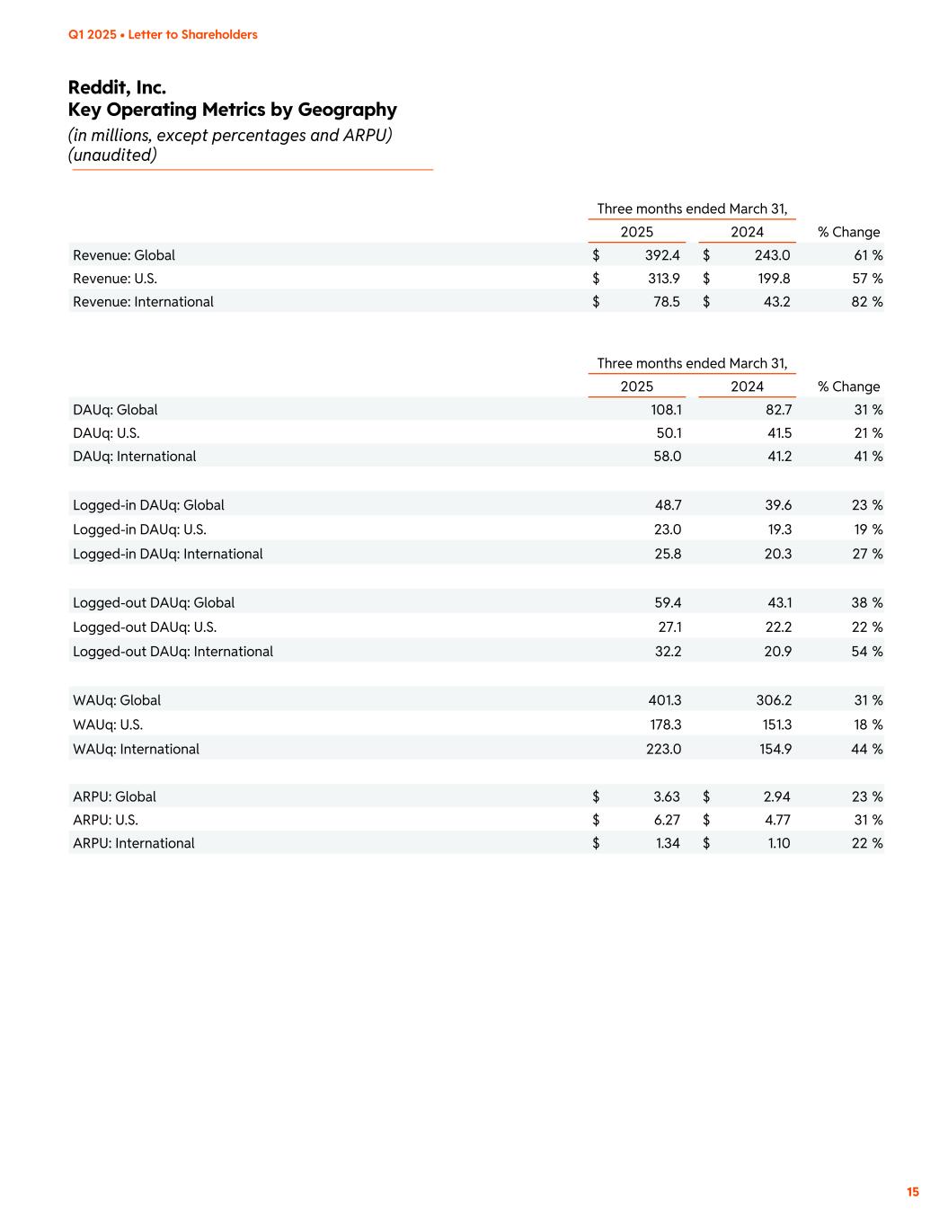 Reddit, Inc. Key Operating Metrics by Geography (in millions, except percentages and ARPU) (unaudited) Q1 2025 • Letter to Shareholders 15 Three months ended March 31, 2025 2024 % Change Revenue: Global $ 392.4 $ 243.0 61 % Revenue: U.S. $ 313.9 $ 199.8 57 % Revenue: International $ 78.5 $ 43.2 82 % Three months ended March 31, 2025 2024 % Change DAUq: Global 108.1 82.7 31 % DAUq: U.S. 50.1 41.5 21 % DAUq: International 58.0 41.2 41 % Logged-in DAUq: Global 48.7 39.6 23 % Logged-in DAUq: U.S. 23.0 19.3 19 % Logged-in DAUq: International 25.8 20.3 27 % Logged-out DAUq: Global 59.4 43.1 38 % Logged-out DAUq: U.S. 27.1 22.2 22 % Logged-out DAUq: International 32.2 20.9 54 % WAUq: Global 401.3 306.2 31 % WAUq: U.S. 178.3 151.3 18 % WAUq: International 223.0 154.9 44 % ARPU: Global $ 3.63 $ 2.94 23 % ARPU: U.S. $ 6.27 $ 4.77 31 % ARPU: International $ 1.34 $ 1.10 22 %