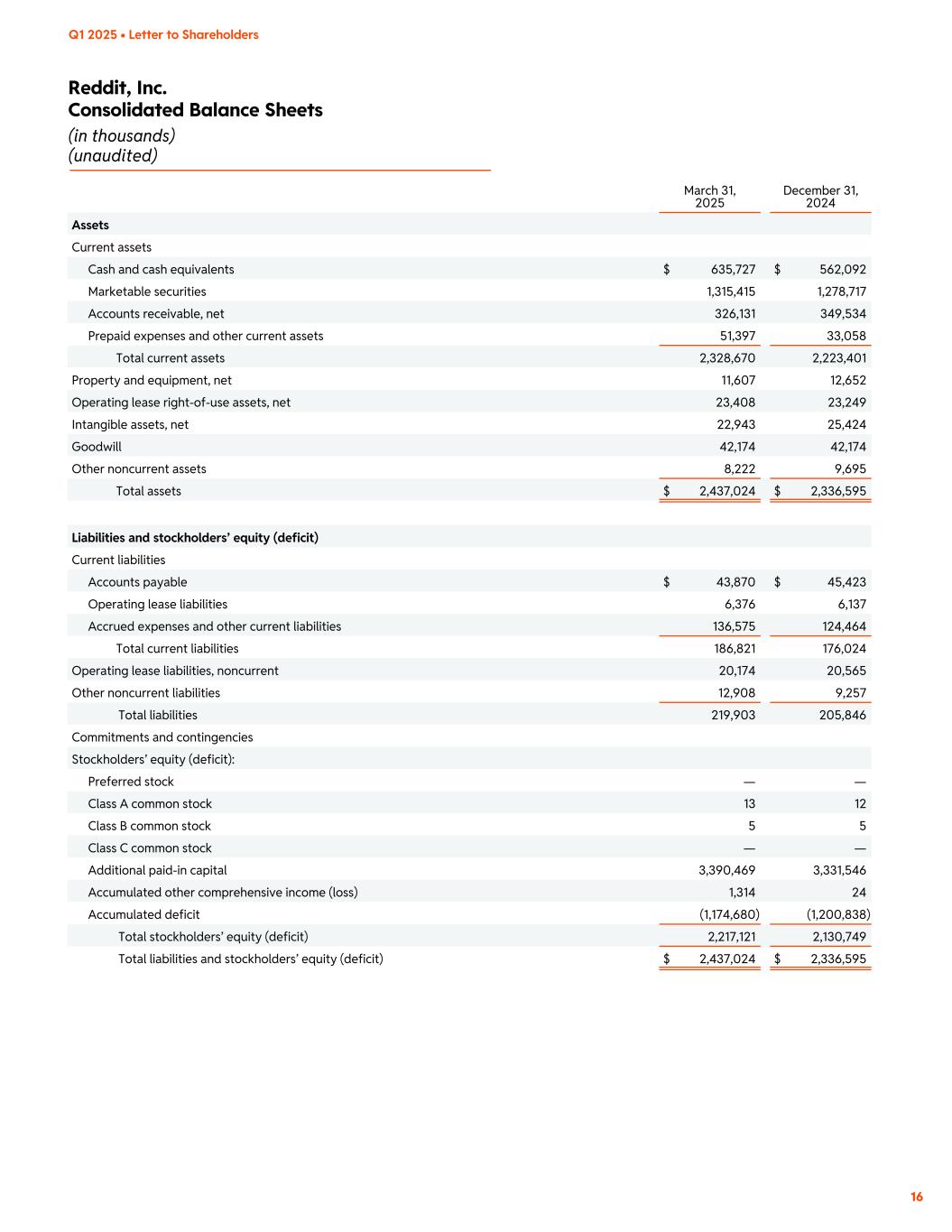 Reddit, Inc. Consolidated Balance Sheets (in thousands) (unaudited) Q1 2025 • Letter to Shareholders 16 March 31, 2025 December 31, 2024 Assets Current assets Cash and cash equivalents $ 635,727 $ 562,092 Marketable securities 1,315,415 1,278,717 Accounts receivable, net 326,131 349,534 Prepaid expenses and other current assets 51,397 33,058 Total current assets 2,328,670 2,223,401 Property and equipment, net 11,607 12,652 Operating lease right-of-use assets, net 23,408 23,249 Intangible assets, net 22,943 25,424 Goodwill 42,174 42,174 Other noncurrent assets 8,222 9,695 Total assets $ 2,437,024 $ 2,336,595 Liabilities and stockholders’ equity (deficit) Current liabilities Accounts payable $ 43,870 $ 45,423 Operating lease liabilities 6,376 6,137 Accrued expenses and other current liabilities 136,575 124,464 Total current liabilities 186,821 176,024 Operating lease liabilities, noncurrent 20,174 20,565 Other noncurrent liabilities 12,908 9,257 Total liabilities 219,903 205,846 Commitments and contingencies Stockholders’ equity (deficit): Preferred stock — — Class A common stock 13 12 Class B common stock 5 5 Class C common stock — — Additional paid-in capital 3,390,469 3,331,546 Accumulated other comprehensive income (loss) 1,314 24 Accumulated deficit (1,174,680) (1,200,838) Total stockholders’ equity (deficit) 2,217,121 2,130,749 Total liabilities and stockholders’ equity (deficit) $ 2,437,024 $ 2,336,595