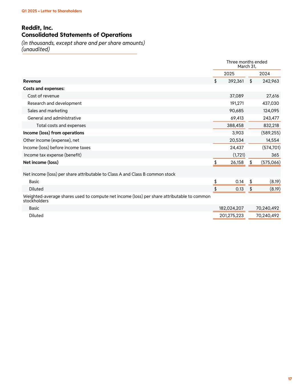 Reddit, Inc. Consolidated Statements of Operations (in thousands, except share and per share amounts) (unaudited) Q1 2025 • Letter to Shareholders 17 Three months ended March 31, 2025 2024 Revenue $ 392,361 $ 242,963 Costs and expenses: Cost of revenue 37,089 27,616 Research and development 191,271 437,030 Sales and marketing 90,685 124,095 General and administrative 69,413 243,477 Total costs and expenses 388,458 832,218 Income (loss) from operations 3,903 (589,255) Other income (expense), net 20,534 14,554 Income (loss) before income taxes 24,437 (574,701) Income tax expense (benefit) (1,721) 365 Net income (loss) $ 26,158 $ (575,066) Net income (loss) per share attributable to Class A and Class B common stock Basic $ 0.14 $ (8.19) Diluted $ 0.13 $ (8.19) Weighted-average shares used to compute net income (loss) per share attributable to common stockholders Basic 182,024,207 70,240,492 Diluted 201,275,223 70,240,492