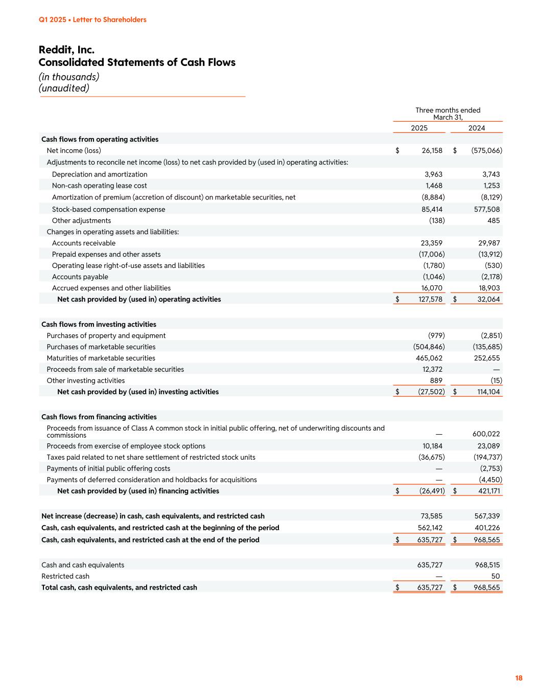 Reddit, Inc. Consolidated Statements of Cash Flows (in thousands) (unaudited) Q1 2025 • Letter to Shareholders 18 Three months ended March 31, 2025 2024 Cash flows from operating activities Net income (loss) $ 26,158 $ (575,066) Adjustments to reconcile net income (loss) to net cash provided by (used in) operating activities: Depreciation and amortization 3,963 3,743 Non-cash operating lease cost 1,468 1,253 Amortization of premium (accretion of discount) on marketable securities, net (8,884) (8,129) Stock-based compensation expense 85,414 577,508 Other adjustments (138) 485 Changes in operating assets and liabilities: Accounts receivable 23,359 29,987 Prepaid expenses and other assets (17,006) (13,912) Operating lease right-of-use assets and liabilities (1,780) (530) Accounts payable (1,046) (2,178) Accrued expenses and other liabilities 16,070 18,903 Net cash provided by (used in) operating activities $ 127,578 $ 32,064 Cash flows from investing activities Purchases of property and equipment (979) (2,851) Purchases of marketable securities (504,846) (135,685) Maturities of marketable securities 465,062 252,655 Proceeds from sale of marketable securities 12,372 — Other investing activities 889 (15) Net cash provided by (used in) investing activities $ (27,502) $ 114,104 Cash flows from financing activities Proceeds from issuance of Class A common stock in initial public offering, net of underwriting discounts and commissions — 600,022 Proceeds from exercise of employee stock options 10,184 23,089 Taxes paid related to net share settlement of restricted stock units (36,675) (194,737) Payments of initial public offering costs — (2,753) Payments of deferred consideration and holdbacks for acquisitions — (4,450) Net cash provided by (used in) financing activities $ (26,491) $ 421,171 Net increase (decrease) in cash, cash equivalents, and restricted cash 73,585 567,339 Cash, cash equivalents, and restricted cash at the beginning of the period 562,142 401,226 Cash, cash equivalents, and restricted cash at the end of the period $ 635,727 $ 968,565 Cash and cash equivalents 635,727 968,515 Restricted cash — 50 Total cash, cash equivalents, and restricted cash $ 635,727 $ 968,565