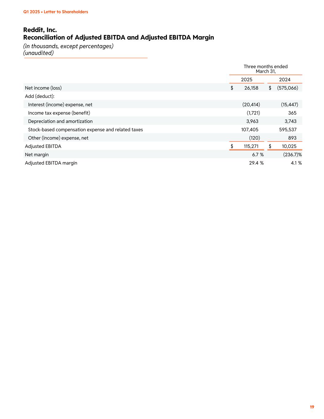 Reddit, Inc. Reconciliation of Adjusted EBITDA and Adjusted EBITDA Margin (in thousands, except percentages) (unaudited) Q1 2025 • Letter to Shareholders 19 Three months ended March 31, 2025 2024 Net income (loss) $ 26,158 $ (575,066) Add (deduct): Interest (income) expense, net (20,414) (15,447) Income tax expense (benefit) (1,721) 365 Depreciation and amortization 3,963 3,743 Stock-based compensation expense and related taxes 107,405 595,537 Other (income) expense, net (120) 893 Adjusted EBITDA $ 115,271 $ 10,025 Net margin 6.7 % (236.7) % Adjusted EBITDA margin 29.4 % 4.1 %