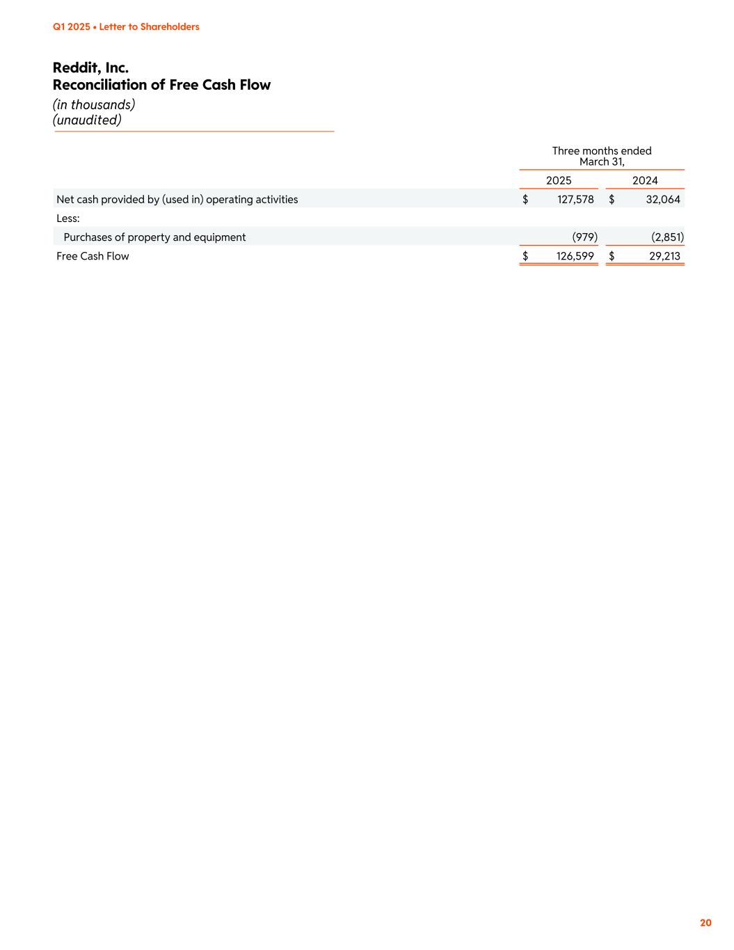 Reddit, Inc. Reconciliation of Free Cash Flow (in thousands) (unaudited) Q1 2025 • Letter to Shareholders 20 Three months ended March 31, 2025 2024 Net cash provided by (used in) operating activities $ 127,578 $ 32,064 Less: Purchases of property and equipment (979) (2,851) Free Cash Flow $ 126,599 $ 29,213