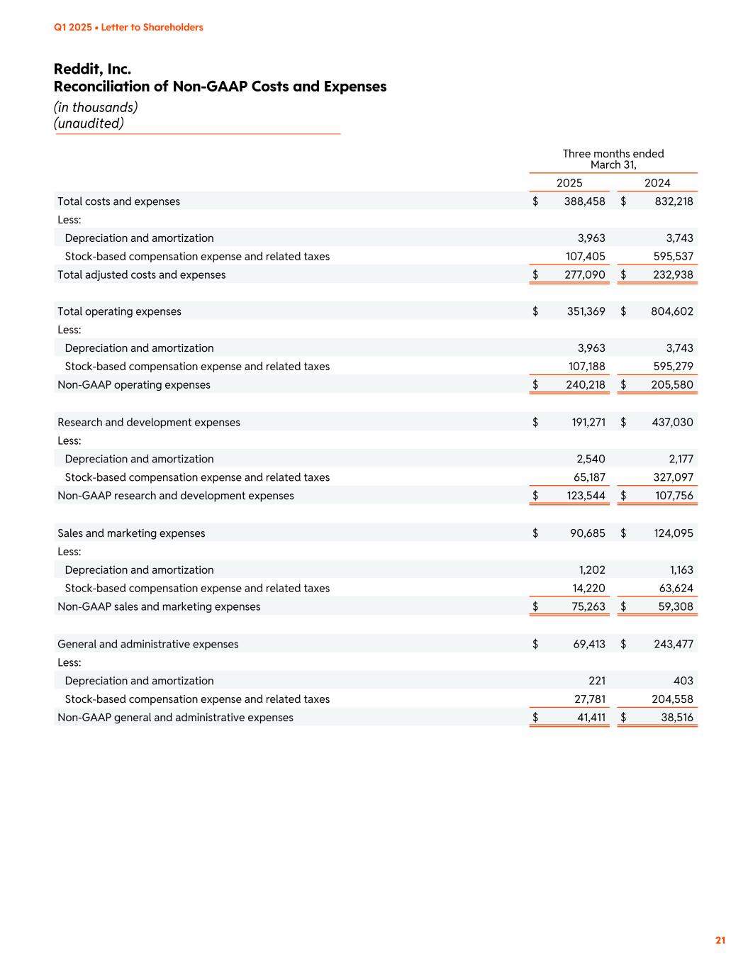 Reddit, Inc. Reconciliation of Non-GAAP Costs and Expenses (in thousands) (unaudited) Q1 2025 • Letter to Shareholders 21 Three months ended March 31, 2025 2024 Total costs and expenses $ 388,458 $ 832,218 Less: Depreciation and amortization 3,963 3,743 Stock-based compensation expense and related taxes 107,405 595,537 Total adjusted costs and expenses $ 277,090 $ 232,938 Total operating expenses $ 351,369 $ 804,602 Less: Depreciation and amortization 3,963 3,743 Stock-based compensation expense and related taxes 107,188 595,279 Non-GAAP operating expenses $ 240,218 $ 205,580 Research and development expenses $ 191,271 $ 437,030 Less: Depreciation and amortization 2,540 2,177 Stock-based compensation expense and related taxes 65,187 327,097 Non-GAAP research and development expenses $ 123,544 $ 107,756 Sales and marketing expenses $ 90,685 $ 124,095 Less: Depreciation and amortization 1,202 1,163 Stock-based compensation expense and related taxes 14,220 63,624 Non-GAAP sales and marketing expenses $ 75,263 $ 59,308 General and administrative expenses $ 69,413 $ 243,477 Less: Depreciation and amortization 221 403 Stock-based compensation expense and related taxes 27,781 204,558 Non-GAAP general and administrative expenses $ 41,411 $ 38,516