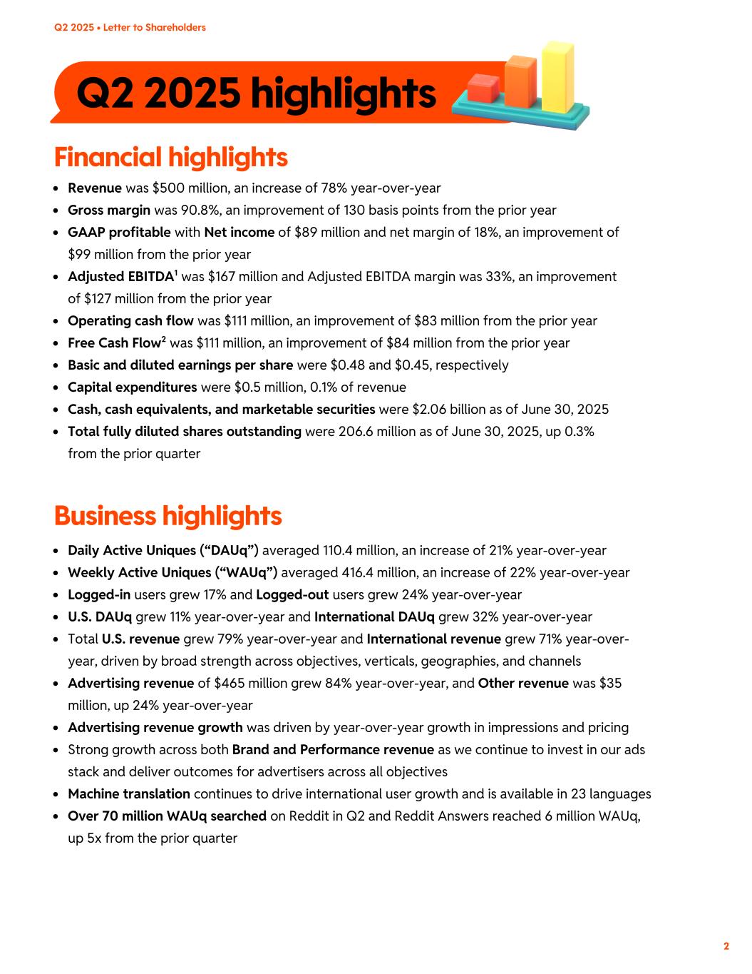 Q2 2025 highlights Revenue was $500 million, an increase of 78% year-over-year Gross margin was 90.8%, an improvement of 130 basis points from the prior year GAAP profitable with Net income of $89 million and net margin of 18%, an improvement of $99 million from the prior year Adjusted EBITDA was $167 million and Adjusted EBITDA margin was 33%, an improvement of $127 million from the prior year 1 Operating cash flow was $111 million, an improvement of $83 million from the prior year Free Cash Flow was $111 million, an improvement of $84 million from the prior year2 Basic and diluted earnings per share were $0.48 and $0.45, respectively Capital expenditures were $0.5 million, 0.1% of revenue Cash, cash equivalents, and marketable securities were $2.06 billion as of June 30, 2025 Total fully diluted shares outstanding were 206.6 million as of June 30, 2025, up 0.3% from the prior quarter Financial highlights 2 Q2 2025 • Letter to Shareholders Daily Active Uniques (“DAUq”) averaged 110.4 million, an increase of 21% year-over-year Weekly Active Uniques (“WAUq”) averaged 416.4 million, an increase of 22% year-over-year Logged-in users grew 17% and Logged-out users grew 24% year-over-year U.S. DAUq grew 11% year-over-year and International DAUq grew 32% year-over-year Total U.S. revenue grew 79% year-over-year and International revenue grew 71% year-over- year, driven by broad strength across objectives, verticals, geographies, and channels Advertising revenue of $465 million grew 84% year-over-year, and Other revenue was $35 million, up 24% year-over-year Advertising revenue growth was driven by year-over-year growth in impressions and pricing Strong growth across both Brand and Performance revenue as we continue to invest in our ads stack and deliver outcomes for advertisers across all objectives Machine translation continues to drive international user growth and is available in 23 languages Over 70 million WAUq searched on Reddit in Q2 and Reddit Answers reached 6 million WAUq, up 5x from the prior quarter Business highlights