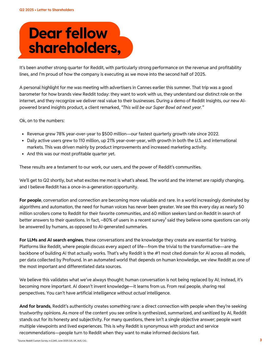 Dear fellow shareholders, It’s been another strong quarter for Reddit, with particularly strong performance on the revenue and profitability lines, and I’m proud of how the company is executing as we move into the second half of 2025. A personal highlight for me was meeting with advertisers in Cannes earlier this summer. That trip was a good barometer for how brands view Reddit today: they want to work with us, they understand our distinct role on the internet, and they recognize we deliver real value to their businesses. During a demo of Reddit Insights, our new AI- powered brand insights product, a client remarked, “This will be our Super Bowl ad next year.” Ok, on to the numbers: Revenue grew 78% year-over-year to $500 million—our fastest quarterly growth rate since 2022. Daily active users grew to 110 million, up 21% year-over-year, with growth in both the U.S. and international markets. This was driven mainly by product improvements and increased marketing activity. And this was our most profitable quarter yet. These results are a testament to our work, our users, and the power of Reddit’s communities. We’ll get to Q2 shortly, but what excites me most is what’s ahead. The world and the internet are rapidly changing, and I believe Reddit has a once-in-a-generation opportunity. For people, conversation and connection are becoming more valuable and rare. In a world increasingly dominated by algorithms and automation, the need for human voices has never been greater. We see this every day as nearly 50 million scrollers come to Reddit for their favorite communities, and 60 million seekers land on Reddit in search of better answers to their questions. In fact, ~80% of users in a recent survey¹ said they believe some questions can only be answered by humans, as opposed to AI-generated summaries. For LLMs and AI search engines, these conversations and the knowledge they create are essential for training. Platforms like Reddit, where people discuss every aspect of life—from the trivial to the transformative—are the backbone of building AI that actually works. That’s why Reddit is the #1 most cited domain for AI across all models, per data collected by Profound. In an automated world that depends on human knowledge, we view Reddit as one of the most important and differentiated data sources. We believe this validates what we’ve always thought: human conversation is not being replaced by AI; instead, it’s becoming more important. AI doesn’t invent knowledge—it learns from us. From real people, sharing real perspectives. You can’t have artificial intelligence without actual intelligence. And for brands, Reddit’s authenticity creates something rare: a direct connection with people when they’re seeking trustworthy opinions. As more of the content you see online is synthesized, summarized, and sanitized by AI, Reddit stands out for its honesty and subjectivity. For many questions, there isn’t a single objective answer; people want multiple viewpoints and lived experiences. This is why Reddit is synonymous with product and service recommendations—people turn to Reddit when they want to make informed decisions fast. 3 Q2 2025 • Letter to Shareholders ¹Source: Reddit Custom Survey, n=2,340, June 2025 (US, UK, AUS, CA).