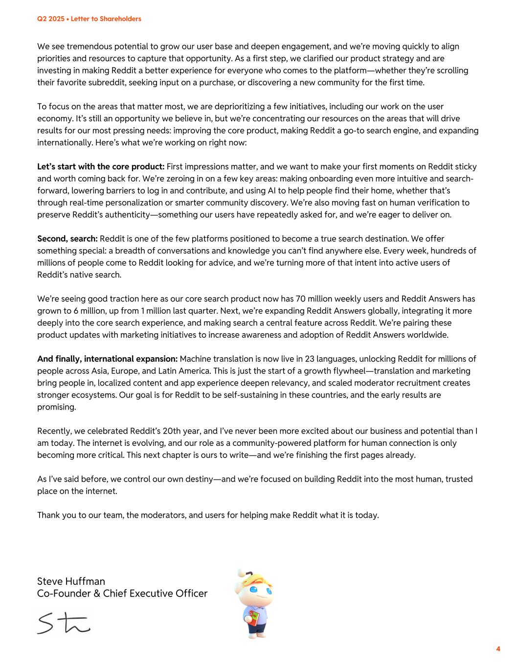 We see tremendous potential to grow our user base and deepen engagement, and we’re moving quickly to align priorities and resources to capture that opportunity. As a first step, we clarified our product strategy and are investing in making Reddit a better experience for everyone who comes to the platform—whether they’re scrolling their favorite subreddit, seeking input on a purchase, or discovering a new community for the first time. To focus on the areas that matter most, we are deprioritizing a few initiatives, including our work on the user economy. It’s still an opportunity we believe in, but we’re concentrating our resources on the areas that will drive results for our most pressing needs: improving the core product, making Reddit a go-to search engine, and expanding internationally. Here’s what we’re working on right now: Let’s start with the core product: First impressions matter, and we want to make your first moments on Reddit sticky and worth coming back for. We’re zeroing in on a few key areas: making onboarding even more intuitive and search- forward, lowering barriers to log in and contribute, and using AI to help people find their home, whether that’s through real-time personalization or smarter community discovery. We’re also moving fast on human verification to preserve Reddit’s authenticity—something our users have repeatedly asked for, and we’re eager to deliver on. Second, search: Reddit is one of the few platforms positioned to become a true search destination. We offer something special: a breadth of conversations and knowledge you can’t find anywhere else. Every week, hundreds of millions of people come to Reddit looking for advice, and we’re turning more of that intent into active users of Reddit’s native search. We’re seeing good traction here as our core search product now has 70 million weekly users and Reddit Answers has grown to 6 million, up from 1 million last quarter. Next, we’re expanding Reddit Answers globally, integrating it more deeply into the core search experience, and making search a central feature across Reddit. We’re pairing these product updates with marketing initiatives to increase awareness and adoption of Reddit Answers worldwide. And finally, international expansion: Machine translation is now live in 23 languages, unlocking Reddit for millions of people across Asia, Europe, and Latin America. This is just the start of a growth flywheel—translation and marketing bring people in, localized content and app experience deepen relevancy, and scaled moderator recruitment creates stronger ecosystems. Our goal is for Reddit to be self-sustaining in these countries, and the early results are promising. Recently, we celebrated Reddit’s 20th year, and I’ve never been more excited about our business and potential than I am today. The internet is evolving, and our role as a community-powered platform for human connection is only becoming more critical. This next chapter is ours to write—and we’re finishing the first pages already. As I’ve said before, we control our own destiny—and we’re focused on building Reddit into the most human, trusted place on the internet. Thank you to our team, the moderators, and users for helping make Reddit what it is today. Steve Huffman Co-Founder & Chief Executive Officer 4 Q2 2025 • Letter to Shareholders