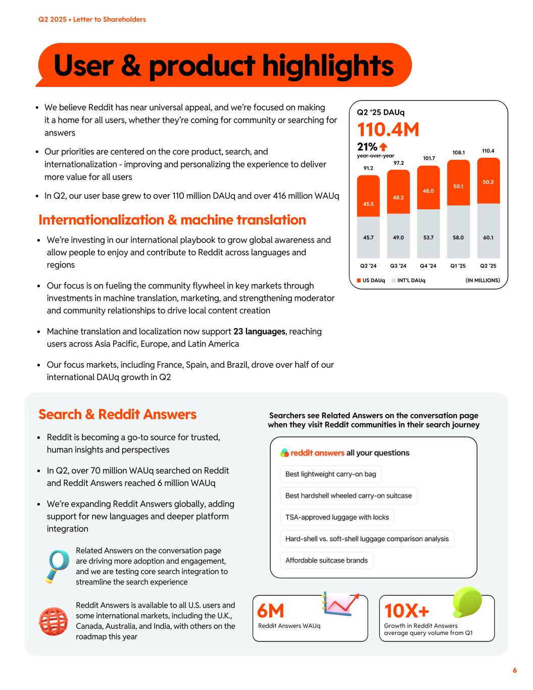 User & product highlights US DAUq INT’L DAUq 6M Reddit Answers WAUq 10X+ Growth in Reddit Answers average query volume from Q1 110.4M 21% We’re investing in our international playbook to grow global awareness and allow people to enjoy and contribute to Reddit across languages and regions Our focus is on fueling the community flywheel in key markets through investments in machine translation, marketing, and strengthening moderator and community relationships to drive local content creation Machine translation and localization now support 23 languages, reaching users across Asia Pacific, Europe, and Latin America Our focus markets, including France, Spain, and Brazil, drove over half of our international DAUq growth in Q2 Related Answers on the conversation page are driving more adoption and engagement, and we are testing core search integration to streamline the search experience Reddit Answers is available to all U.S. users and some international markets, including the U.K., Canada, Australia, and India, with others on the roadmap this year Reddit is becoming a go-to source for trusted, human insights and perspectives In Q2, over 70 million WAUq searched on Reddit and Reddit Answers reached 6 million WAUq We’re expanding Reddit Answers globally, adding support for new languages and deeper platform integration Internationalization & machine translation We believe Reddit has near universal appeal, and we’re focused on making it a home for all users, whether they’re coming for community or searching for answers Our priorities are centered on the core product, search, and internationalization - improving and personalizing the experience to deliver more value for all users In Q2, our user base grew to over 110 million DAUq and over 416 million WAUq (IN MILLIONS) Search & Reddit Answers 50.3 Q1 '25Q2 '24 Q3 '24 Q4 '24 Q2 '25 45.5 48.2 48.0 50.1 60.145.7 49.0 53.7 58.0 110.4 91.2 97.2 101.7 108.1 Q2 ‘25 DAUq year-over-year 6 Q2 2025 • Letter to Shareholders Searchers see Related Answers on the conversation page when they visit Reddit communities in their search journey