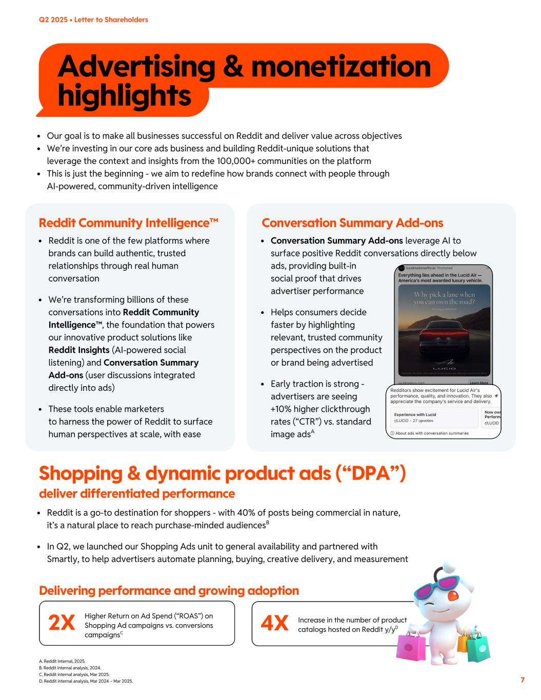 Advertising & monetization highlights Conversation Summary Add-ons leverage AI to surface positive Reddit conversations directly below ads, providing built-in social proof that drives advertiser performance Helps consumers decide faster by highlighting relevant, trusted community perspectives on the product or brand being advertised Early traction is strong - advertisers are seeing +10% higher clickthrough rates (“CTR”) vs. standard image adsA Reddit is one of the few platforms where brands can build authentic, trusted relationships through real human conversation We’re transforming billions of these conversations into Reddit Community Intelligence™, the foundation that powers our innovative product solutions like Reddit Insights (AI-powered social listening) and Conversation Summary Add-ons (user discussions integrated directly into ads) These tools enable marketers to harness the power of Reddit to surface human perspectives at scale, with ease A. Reddit Internal, 2025. B. Reddit internal analysis, 2024. C. Reddit internal analysis, Mar 2025. D. Reddit internal analysis, Mar 2024 – Mar 2025. 7 Our goal is to make all businesses successful on Reddit and deliver value across objectives We’re investing in our core ads business and building Reddit-unique solutions that leverage the context and insights from the 100,000+ communities on the platform This is just the beginning - we aim to redefine how brands connect with people through AI-powered, community-driven intelligence Reddit Community Intelligence™ Conversation Summary Add-ons Q2 2025 • Letter to Shareholders Reddit is a go-to destination for shoppers - with 40% of posts being commercial in nature, it’s a natural place to reach purchase-minded audiencesB In Q2, we launched our Shopping Ads unit to general availability and partnered with Smartly, to help advertisers automate planning, buying, creative delivery, and measurement 2X Higher Return on Ad Spend (“ROAS”) on Shopping Ad campaigns vs. conversions campaignsC 4X Increase in the number of product catalogs hosted on Reddit y/yD Shopping & dynamic product ads (“DPA”) deliver differentiated performance Delivering performance and growing adoption