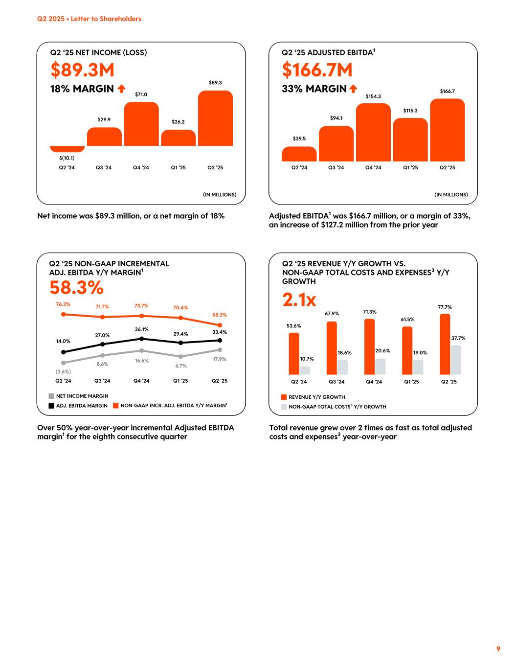 33% MARGIN18% MARGIN $166.7M 2.1x $89.3M 58.3% Q2 ‘25 NET INCOME (LOSS) Q3 '24 Q4 '24 Q1 '25 Q2 '25Q2 '24 (IN MILLIONS) Net income was $89.3 million, or a net margin of 18% $71.0 $89.3 $(10.1) $29.9 $26.2 NON-GAAP TOTAL COSTS³ Y/Y GROWTH REVENUE Y/Y GROWTH Total revenue grew over 2 times as fast as total adjusted costs and expenses³ year-over-year 53.6% 10.7% 67.9% 18.6% 71.3% 20.6% 61.5% 19.0% 77.7% 37.7% Q2 ‘25 REVENUE Y/Y GROWTH VS. NON-GAAP TOTAL COSTS AND EXPENSES³ Y/Y GROWTH Q3 '24 Q4 '24 Q1 '25 Q2 '25Q2 '24 Q2 ‘25 ADJUSTED EBITDA¹ Q3 '24 Q4 '24 Q1 '25 Q2 '25Q2 '24 (IN MILLIONS) Adjusted EBITDA¹ was $166.7 million, or a margin of 33%, an increase of $127.2 million from the prior year $39.5 $166.7 $94.1 $154.3 $115.3 Over 50% year-over-year incremental Adjusted EBITDA margin¹ for the eighth consecutive quarter 76.3% 14.0% 71.7% 27.0% (3.6%) 8.6% 36.1% 16.6% 70.4% 29.4% 6.7% 73.7% 58.3% 33.4% 17.9% Q2 ‘25 NON-GAAP INCREMENTAL ADJ. EBITDA Y/Y MARGIN¹ NON-GAAP INCR. ADJ. EBITDA Y/Y MARGIN¹ NET INCOME MARGIN Q2 '25 ADJ. EBITDA MARGIN Q1 '25Q4 '24Q3 '24Q2 '24 9 Q2 2025 • Letter to Shareholders
