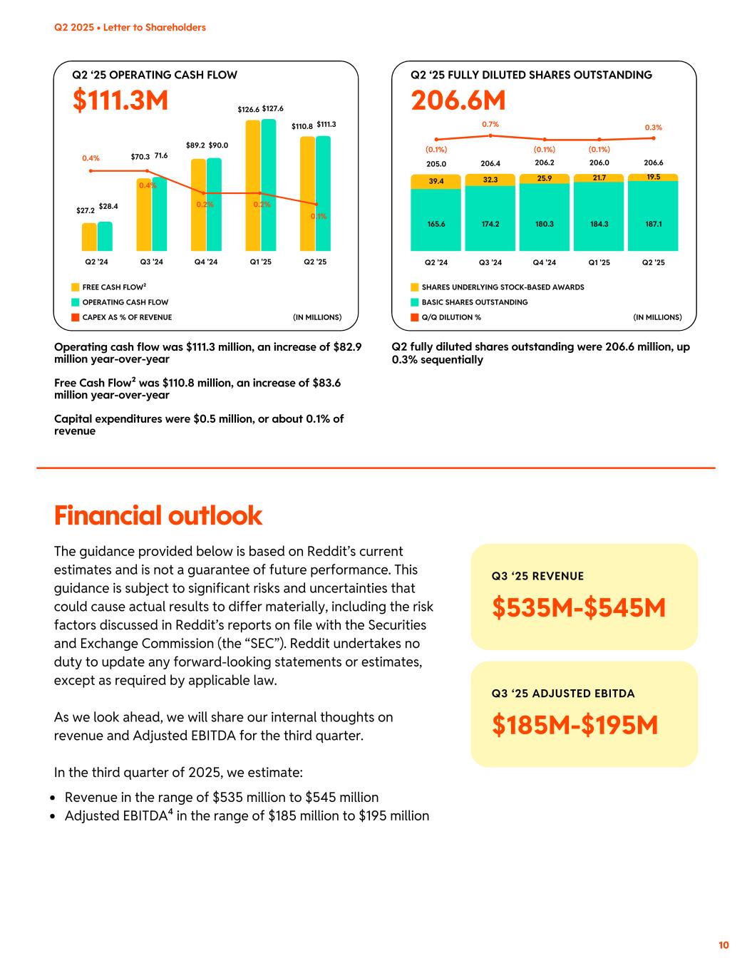 $111.3M Q3 ‘25 REVENUE $535M-$545M Q3 ‘25 ADJUSTED EBITDA $185M-$195M BASIC SHARES OUTSTANDING SHARES UNDERLYING STOCK-BASED AWARDS Q/Q DILUTION % $70.3 $89.2 0.4% 0.4% 0.2% 0.2% 0.1% $126.6 $110.8 71.6 $27.2 $28.4 $90.0 $127.6 $111.3 Q3 '24 Q4 '24 Q1 '25 Q2 '25Q2 '24 Operating cash flow was $111.3 million, an increase of $82.9 million year-over-year Free Cash Flow² was $110.8 million, an increase of $83.6 million year-over-year Capital expenditures were $0.5 million, or about 0.1% of revenue Q2 ‘25 OPERATING CASH FLOW OPERATING CASH FLOW FREE CASH FLOW² (IN MILLIONS)CAPEX AS % OF REVENUE 0.7% 206.6M Q2 ‘25 FULLY DILUTED SHARES OUTSTANDING 206.2 206.0 206.6205.0 206.4 Q3 '24 Q4 '24 Q1 '25 Q2 '25Q2 '24 180.3 187.1165.6 174.2 184.3 25.9 19.539.4 32.3 21.7 (0.1%) (0.1%) (0.1%) 0.3% (IN MILLIONS) Q2 fully diluted shares outstanding were 206.6 million, up 0.3% sequentially The guidance provided below is based on Reddit’s current estimates and is not a guarantee of future performance. This guidance is subject to significant risks and uncertainties that could cause actual results to differ materially, including the risk factors discussed in Reddit’s reports on file with the Securities and Exchange Commission (the “SEC”). Reddit undertakes no duty to update any forward-looking statements or estimates, except as required by applicable law. As we look ahead, we will share our internal thoughts on revenue and Adjusted EBITDA for the third quarter. In the third quarter of 2025, we estimate: Revenue in the range of $535 million to $545 million Adjusted EBITDA⁴ in the range of $185 million to $195 million Financial outlook 10 Q2 2025 • Letter to Shareholders