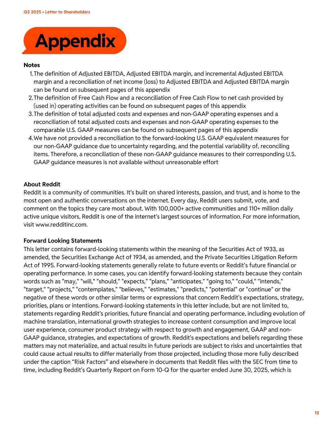 Appendix Notes 1.The definition of Adjusted EBITDA, Adjusted EBITDA margin, and incremental Adjusted EBITDA margin and a reconciliation of net income (loss) to Adjusted EBITDA and Adjusted EBITDA margin can be found on subsequent pages of this appendix 2.The definition of Free Cash Flow and a reconciliation of Free Cash Flow to net cash provided by (used in) operating activities can be found on subsequent pages of this appendix 3.The definition of total adjusted costs and expenses and non-GAAP operating expenses and a reconciliation of total adjusted costs and expenses and non-GAAP operating expenses to the comparable U.S. GAAP measures can be found on subsequent pages of this appendix 4.We have not provided a reconciliation to the forward-looking U.S. GAAP equivalent measures for our non-GAAP guidance due to uncertainty regarding, and the potential variability of, reconciling items. Therefore, a reconciliation of these non-GAAP guidance measures to their corresponding U.S. GAAP guidance measures is not available without unreasonable effort About Reddit Reddit is a community of communities. It’s built on shared interests, passion, and trust, and is home to the most open and authentic conversations on the internet. Every day, Reddit users submit, vote, and comment on the topics they care most about. With 100,000+ active communities and 110+ million daily active unique visitors, Reddit is one of the internet’s largest sources of information. For more information, visit www.redditinc.com. Forward Looking Statements This letter contains forward-looking statements within the meaning of the Securities Act of 1933, as amended, the Securities Exchange Act of 1934, as amended, and the Private Securities Litigation Reform Act of 1995. Forward-looking statements generally relate to future events or Reddit's future financial or operating performance. In some cases, you can identify forward-looking statements because they contain words such as "may," "will," "should," "expects," "plans," "anticipates," "going to," "could," "intends," "target," "projects," "contemplates," "believes," "estimates," "predicts," "potential" or "continue" or the negative of these words or other similar terms or expressions that concern Reddit's expectations, strategy, priorities, plans or intentions. Forward-looking statements in this letter include, but are not limited to, statements regarding Reddit’s priorities, future financial and operating performance, including evolution of machine translation, international growth strategies to increase content consumption and improve local user experience, consumer product strategy with respect to growth and engagement, GAAP and non- GAAP guidance, strategies, and expectations of growth. Reddit's expectations and beliefs regarding these matters may not materialize, and actual results in future periods are subject to risks and uncertainties that could cause actual results to differ materially from those projected, including those more fully described under the caption “Risk Factors” and elsewhere in documents that Reddit files with the SEC from time to time, including Reddit’s Quarterly Report on Form 10-Q for the quarter ended June 30, 2025, which is 12 Q2 2025 • Letter to Shareholders