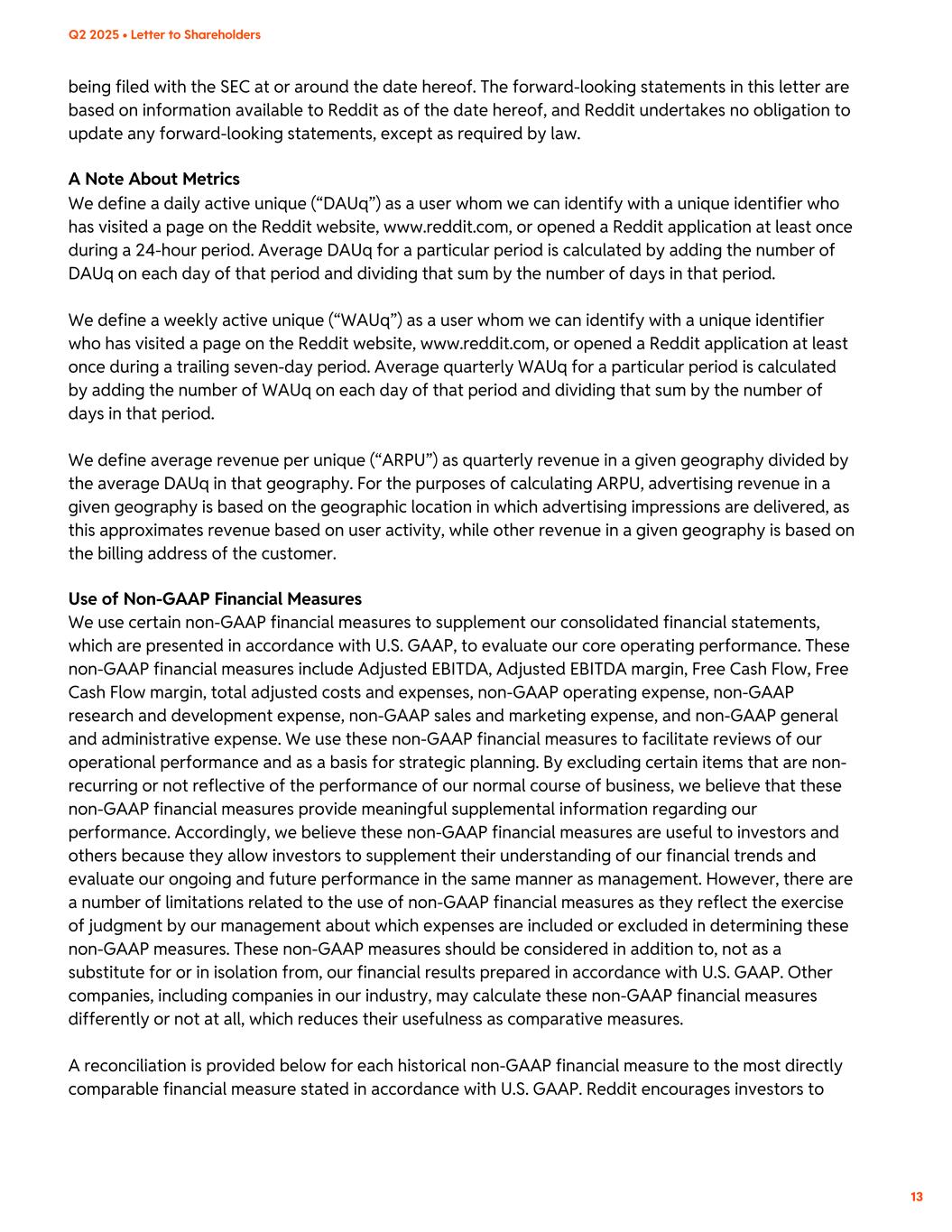 being filed with the SEC at or around the date hereof. The forward-looking statements in this letter are based on information available to Reddit as of the date hereof, and Reddit undertakes no obligation to update any forward-looking statements, except as required by law. A Note About Metrics We define a daily active unique (“DAUq”) as a user whom we can identify with a unique identifier who has visited a page on the Reddit website, www.reddit.com, or opened a Reddit application at least once during a 24-hour period. Average DAUq for a particular period is calculated by adding the number of DAUq on each day of that period and dividing that sum by the number of days in that period. We define a weekly active unique (“WAUq”) as a user whom we can identify with a unique identifier who has visited a page on the Reddit website, www.reddit.com, or opened a Reddit application at least once during a trailing seven-day period. Average quarterly WAUq for a particular period is calculated by adding the number of WAUq on each day of that period and dividing that sum by the number of days in that period. We define average revenue per unique (“ARPU”) as quarterly revenue in a given geography divided by the average DAUq in that geography. For the purposes of calculating ARPU, advertising revenue in a given geography is based on the geographic location in which advertising impressions are delivered, as this approximates revenue based on user activity, while other revenue in a given geography is based on the billing address of the customer. Use of Non-GAAP Financial Measures We use certain non-GAAP financial measures to supplement our consolidated financial statements, which are presented in accordance with U.S. GAAP, to evaluate our core operating performance. These non-GAAP financial measures include Adjusted EBITDA, Adjusted EBITDA margin, Free Cash Flow, Free Cash Flow margin, total adjusted costs and expenses, non-GAAP operating expense, non-GAAP research and development expense, non-GAAP sales and marketing expense, and non-GAAP general and administrative expense. We use these non-GAAP financial measures to facilitate reviews of our operational performance and as a basis for strategic planning. By excluding certain items that are non- recurring or not reflective of the performance of our normal course of business, we believe that these non-GAAP financial measures provide meaningful supplemental information regarding our performance. Accordingly, we believe these non-GAAP financial measures are useful to investors and others because they allow investors to supplement their understanding of our financial trends and evaluate our ongoing and future performance in the same manner as management. However, there are a number of limitations related to the use of non-GAAP financial measures as they reflect the exercise of judgment by our management about which expenses are included or excluded in determining these non-GAAP measures. These non-GAAP measures should be considered in addition to, not as a substitute for or in isolation from, our financial results prepared in accordance with U.S. GAAP. Other companies, including companies in our industry, may calculate these non-GAAP financial measures differently or not at all, which reduces their usefulness as comparative measures. A reconciliation is provided below for each historical non-GAAP financial measure to the most directly comparable financial measure stated in accordance with U.S. GAAP. Reddit encourages investors to 13 Q2 2025 • Letter to Shareholders