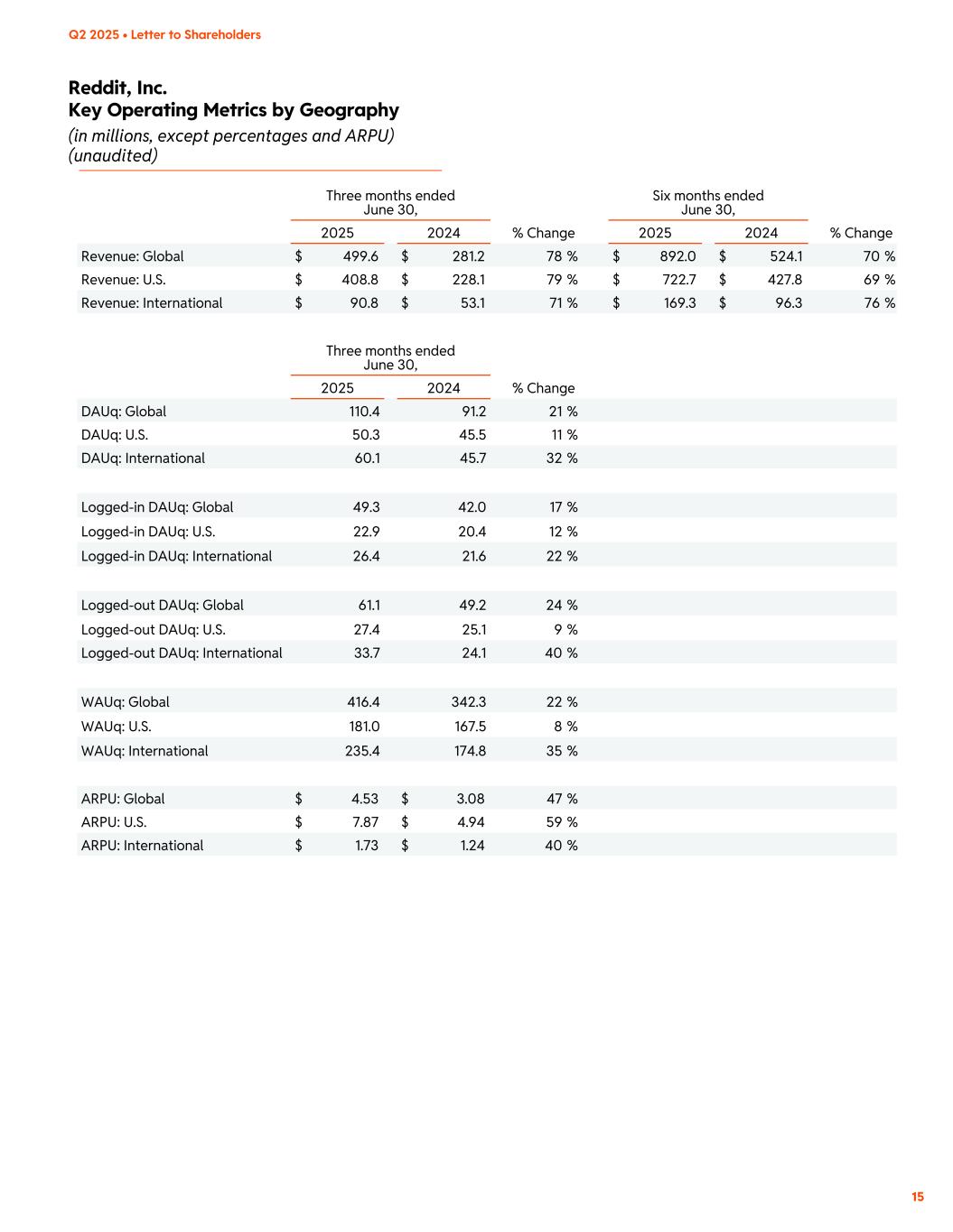Reddit, Inc. Key Operating Metrics by Geography (in millions, except percentages and ARPU) (unaudited) 15 Q2 2025 • Letter to Shareholders Three months ended June 30, Six months ended June 30, 2025 2024 % Change 2025 2024 % Change Revenue: Global $ 499.6 $ 281.2 78 % $ 892.0 $ 524.1 70 % Revenue: U.S. $ 408.8 $ 228.1 79 % $ 722.7 $ 427.8 69 % Revenue: International $ 90.8 $ 53.1 71 % $ 169.3 $ 96.3 76 % Three months ended June 30, 2025 2024 % Change DAUq: Global 110.4 91.2 21 % DAUq: U.S. 50.3 45.5 11 % DAUq: International 60.1 45.7 32 % Logged-in DAUq: Global 49.3 42.0 17 % Logged-in DAUq: U.S. 22.9 20.4 12 % Logged-in DAUq: International 26.4 21.6 22 % Logged-out DAUq: Global 61.1 49.2 24 % Logged-out DAUq: U.S. 27.4 25.1 9 % Logged-out DAUq: International 33.7 24.1 40 % WAUq: Global 416.4 342.3 22 % WAUq: U.S. 181.0 167.5 8 % WAUq: International 235.4 174.8 35 % ARPU: Global $ 4.53 $ 3.08 47 % ARPU: U.S. $ 7.87 $ 4.94 59 % ARPU: International $ 1.73 $ 1.24 40 %