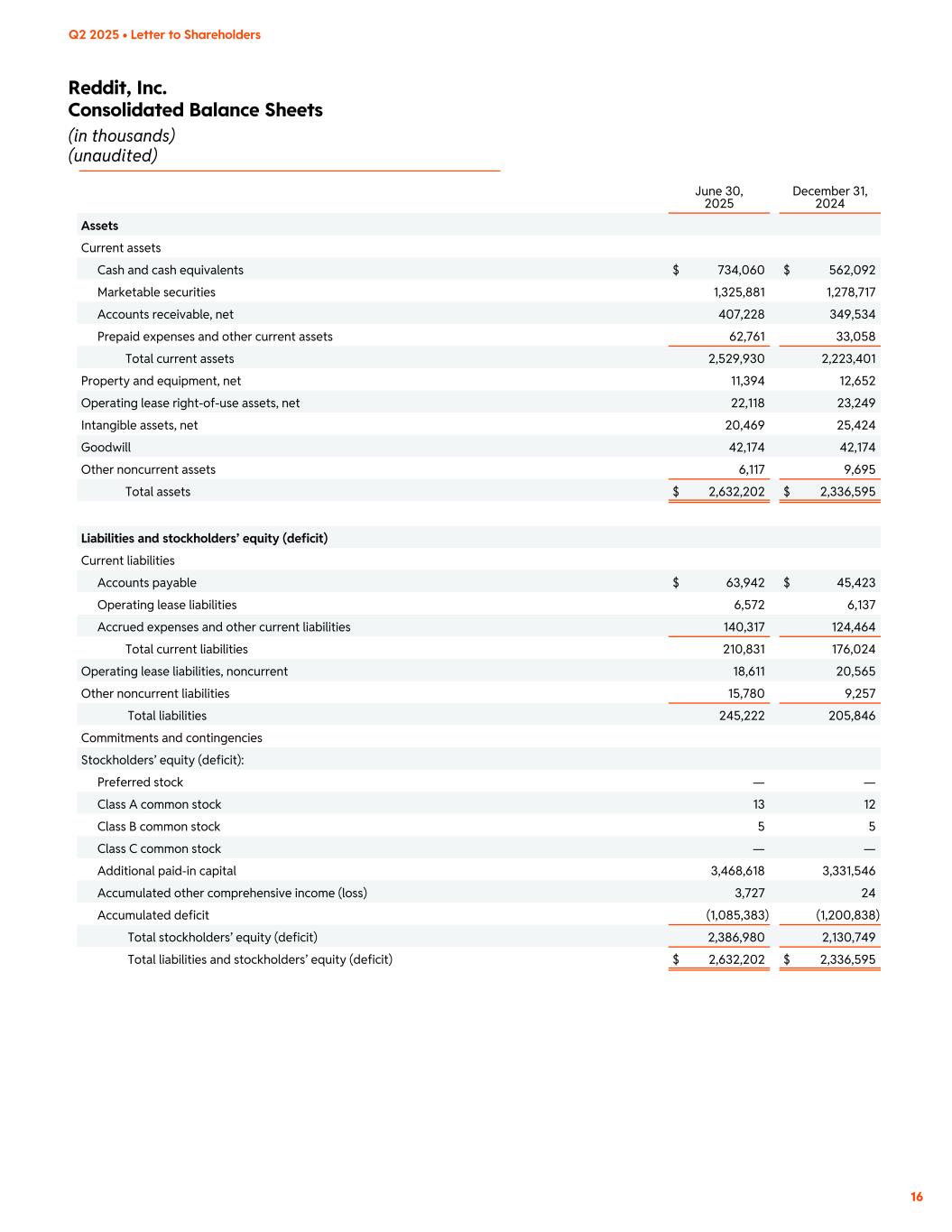 Reddit, Inc. Consolidated Balance Sheets (in thousands) (unaudited) 16 Q2 2025 • Letter to Shareholders June 30, 2025 December 31, 2024 Assets Current assets Cash and cash equivalents $ 734,060 $ 562,092 Marketable securities 1,325,881 1,278,717 Accounts receivable, net 407,228 349,534 Prepaid expenses and other current assets 62,761 33,058 Total current assets 2,529,930 2,223,401 Property and equipment, net 11,394 12,652 Operating lease right-of-use assets, net 22,118 23,249 Intangible assets, net 20,469 25,424 Goodwill 42,174 42,174 Other noncurrent assets 6,117 9,695 Total assets $ 2,632,202 $ 2,336,595 Liabilities and stockholders’ equity (deficit) Current liabilities Accounts payable $ 63,942 $ 45,423 Operating lease liabilities 6,572 6,137 Accrued expenses and other current liabilities 140,317 124,464 Total current liabilities 210,831 176,024 Operating lease liabilities, noncurrent 18,611 20,565 Other noncurrent liabilities 15,780 9,257 Total liabilities 245,222 205,846 Commitments and contingencies Stockholders’ equity (deficit): Preferred stock — — Class A common stock 13 12 Class B common stock 5 5 Class C common stock — — Additional paid-in capital 3,468,618 3,331,546 Accumulated other comprehensive income (loss) 3,727 24 Accumulated deficit (1,085,383) (1,200,838) Total stockholders’ equity (deficit) 2,386,980 2,130,749 Total liabilities and stockholders’ equity (deficit) $ 2,632,202 $ 2,336,595