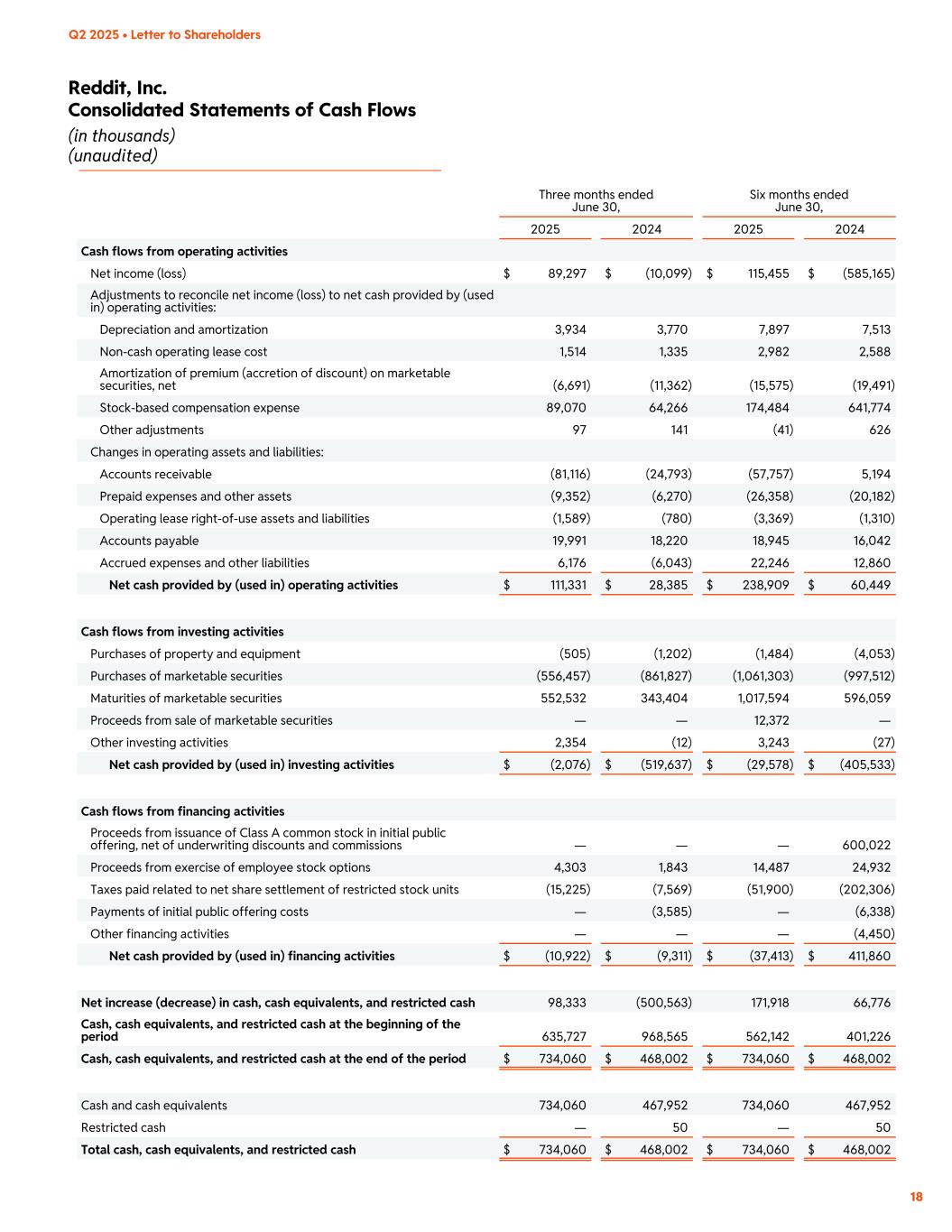 Reddit, Inc. Consolidated Statements of Cash Flows (in thousands) (unaudited) 18 Q2 2025 • Letter to Shareholders Three months ended June 30, Six months ended June 30, 2025 2024 2025 2024 Cash flows from operating activities Net income (loss) $ 89,297 $ (10,099) $ 115,455 $ (585,165) Adjustments to reconcile net income (loss) to net cash provided by (used in) operating activities: Depreciation and amortization 3,934 3,770 7,897 7,513 Non-cash operating lease cost 1,514 1,335 2,982 2,588 Amortization of premium (accretion of discount) on marketable securities, net (6,691) (11,362) (15,575) (19,491) Stock-based compensation expense 89,070 64,266 174,484 641,774 Other adjustments 97 141 (41) 626 Changes in operating assets and liabilities: Accounts receivable (81,116) (24,793) (57,757) 5,194 Prepaid expenses and other assets (9,352) (6,270) (26,358) (20,182) Operating lease right-of-use assets and liabilities (1,589) (780) (3,369) (1,310) Accounts payable 19,991 18,220 18,945 16,042 Accrued expenses and other liabilities 6,176 (6,043) 22,246 12,860 Net cash provided by (used in) operating activities $ 111,331 $ 28,385 $ 238,909 $ 60,449 Cash flows from investing activities Purchases of property and equipment (505) (1,202) (1,484) (4,053) Purchases of marketable securities (556,457) (861,827) (1,061,303) (997,512) Maturities of marketable securities 552,532 343,404 1,017,594 596,059 Proceeds from sale of marketable securities — — 12,372 — Other investing activities 2,354 (12) 3,243 (27) Net cash provided by (used in) investing activities $ (2,076) $ (519,637) $ (29,578) $ (405,533) Cash flows from financing activities Proceeds from issuance of Class A common stock in initial public offering, net of underwriting discounts and commissions — — — 600,022 Proceeds from exercise of employee stock options 4,303 1,843 14,487 24,932 Taxes paid related to net share settlement of restricted stock units (15,225) (7,569) (51,900) (202,306) Payments of initial public offering costs — (3,585) — (6,338) Other financing activities — — — (4,450) Net cash provided by (used in) financing activities $ (10,922) $ (9,311) $ (37,413) $ 411,860 Net increase (decrease) in cash, cash equivalents, and restricted cash 98,333 (500,563) 171,918 66,776 Cash, cash equivalents, and restricted cash at the beginning of the period 635,727 968,565 562,142 401,226 Cash, cash equivalents, and restricted cash at the end of the period $ 734,060 $ 468,002 $ 734,060 $ 468,002 Cash and cash equivalents 734,060 467,952 734,060 467,952 Restricted cash — 50 — 50 Total cash, cash equivalents, and restricted cash $ 734,060 $ 468,002 $ 734,060 $ 468,002