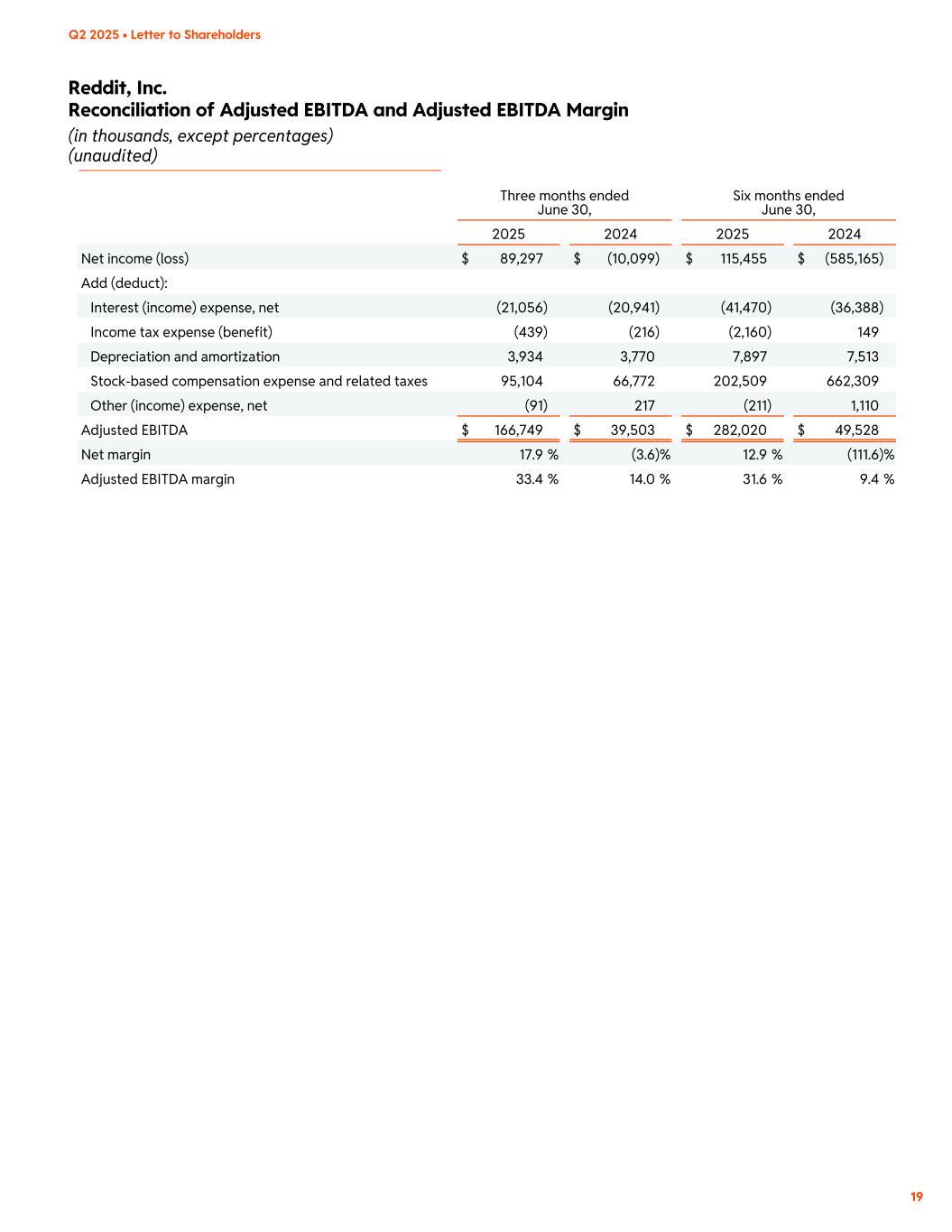 Reddit, Inc. Reconciliation of Adjusted EBITDA and Adjusted EBITDA Margin (in thousands, except percentages) (unaudited) 19 Q2 2025 • Letter to Shareholders Three months ended June 30, Six months ended June 30, 2025 2024 2025 2024 Net income (loss) $ 89,297 $ (10,099) $ 115,455 $ (585,165) Add (deduct): Interest (income) expense, net (21,056) (20,941) (41,470) (36,388) Income tax expense (benefit) (439) (216) (2,160) 149 Depreciation and amortization 3,934 3,770 7,897 7,513 Stock-based compensation expense and related taxes 95,104 66,772 202,509 662,309 Other (income) expense, net (91) 217 (211) 1,110 Adjusted EBITDA $ 166,749 $ 39,503 $ 282,020 $ 49,528 Net margin 17.9 % (3.6) % 12.9 % (111.6) % Adjusted EBITDA margin 33.4 % 14.0 % 31.6 % 9.4 %