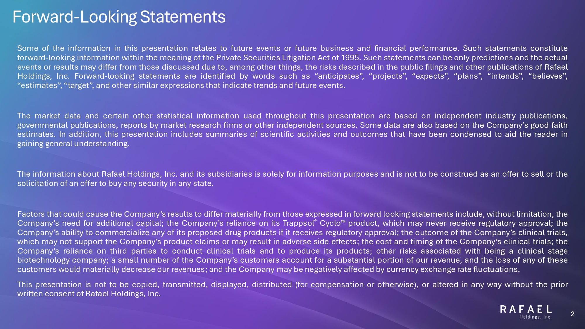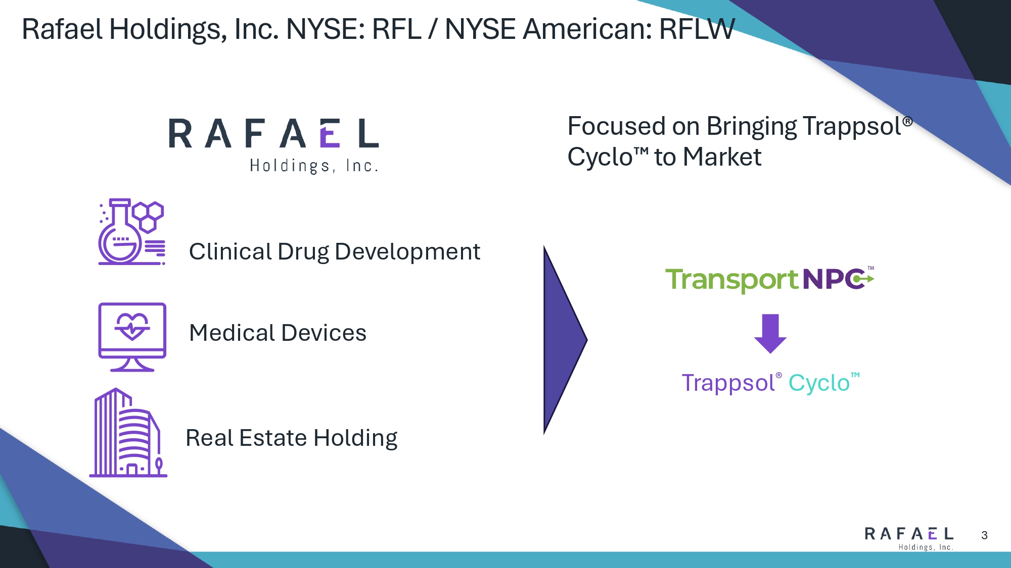 Forward - Looking Statements Some of the information in this presentation relates to future events or future business and financial performance . Such statements constitute forward - looking information within the meaning of the Private Securities Litigation Act of 1995 . Such statements can be only predictions and the actual events or results may differ from those discussed due to, among other things, the risks described in the public filings and other publications of Rafael Holdings, Inc . Forward - looking statements are identified by words such as “anticipates”, “projects”, “expects”, “plans”, “intends”, “believes”, “estimates”, “target”, and other similar expressions that indicate trends and future events . The market data and certain other statistical information used throughout this presentation are based on independent industry publications, governmental publications, reports by market research firms or other independent sources . Some data are also based on the Company’s good faith estimates . In addition, this presentation includes summaries of scientific activities and outcomes that have been condensed to aid the reader in gaining general understanding . The information about Rafael Holdings, Inc . and its subsidiaries is solely for information purposes and is not to be construed as an offer to sell or the solicitation of an offer to buy any security in any state . Factors that could cause the Company’s results to differ materially from those expressed in forward looking statements include, without limitation, the Company’s need for additional capital ; the Company’s reliance on its Trappsol ® Cyclo product, which may never receive regulatory approval ; the Company’s ability to commercialize any of its proposed drug products if it receives regulatory approval ; the outcome of the Company’s clinical trials, which may not support the Company’s product claims or may result in adverse side effects ; the cost and timing of the Company’s clinical trials ; the Company’s reliance on third parties to conduct clinical trials and to produce its products ; other risks associated with being a clinical stage biotechnology company ; a small number of the Company’s customers account for a substantial portion of our revenue, and the loss of any of these customers would materially decrease our revenues ; and the Company may be negatively affected by currency exchange rate fluctuations . This presentation is not to be copied, transmitted, displayed, distributed (for compensation or otherwise), or altered in any way without the prior written consent of Rafael Holdings, Inc . 2
