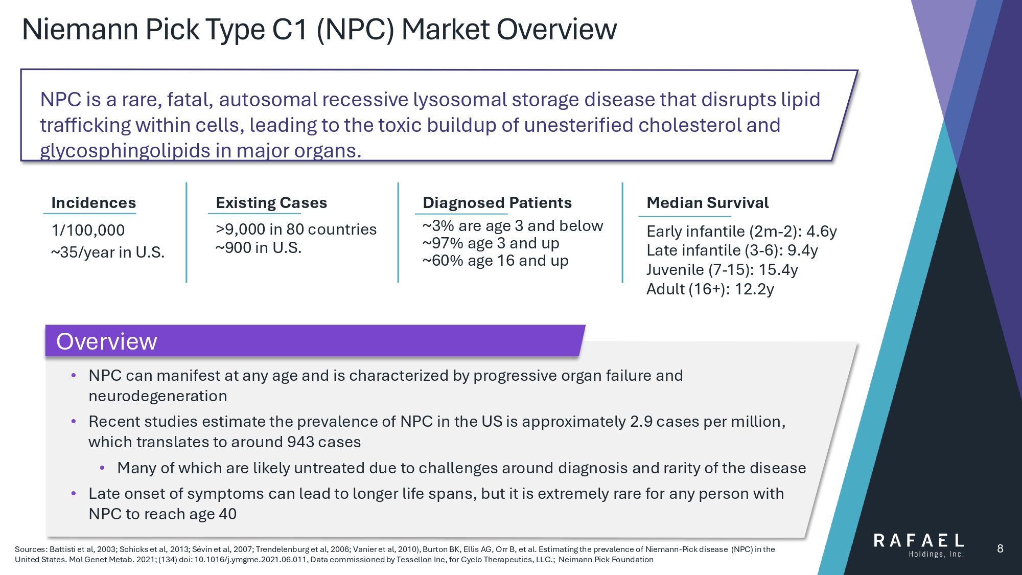 Investment Highlights 4 Experienced team with strong track record of success Lead program Trappsol ® Cyclo in Phase 3 trial for the treatment of Niemann - Pick Disease Type C 1 High unmet medical need in NPC; global market expected to reach >$920m by 2031 Independent unblinded Data Monitoring Committee (DMC) performed Interim analysis in June 2025 and recommended continuation of the study through final analysis at 96 - weeks. Strong balance sheet with sufficient capital to fund through multiple potentially value creating milestones Late clinical - stage biotechnology company dedicated to developing life - changing medicines through science and innovation for patients and families living with challenging diseases