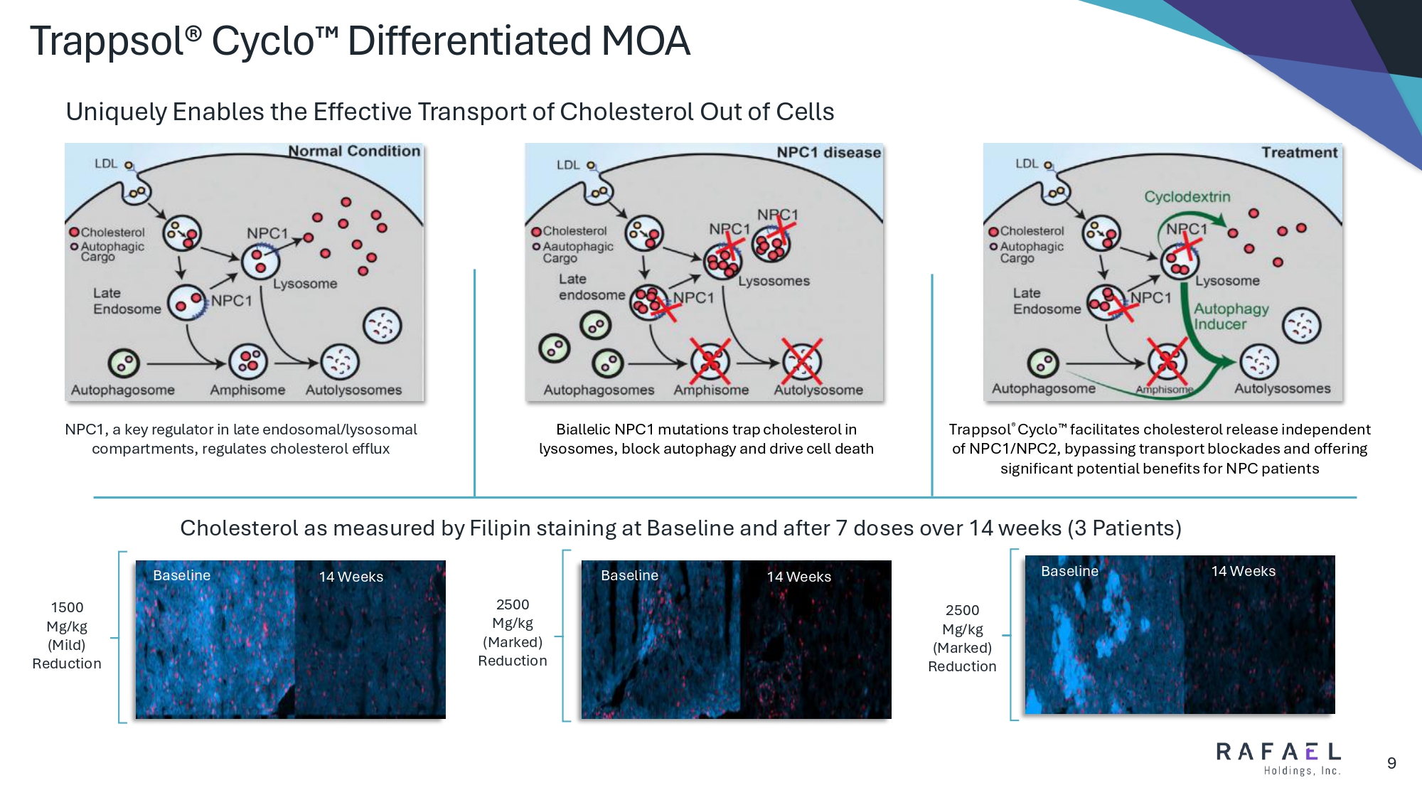 Niemann Pick Type C1 (NPC) Market Overview 8 Incidences 1/100,000 ~35/year in U.S. ~3% are age 3 and below Diagnosed Patients ~97% age 3 and up ~60% age 16 and up Median Survival Early infantile (2m - 2): 4.6y Late infantile (3 - 6): 9.4y Juvenile (7 - 15): 15.4y Adult (16+): 12.2y Existing Cases >9,000 in 80 countries ~900 in U.S. • NPC can manifest at any age and is characterized by progressive organ failure and neurodegeneration • Recent studies estimate the prevalence of NPC in the US is approximately 2.9 cases per million, which translates to around 943 cases • Many of which are likely untreated due to challenges around diagnosis and rarity of the disease • Late onset of symptoms can lead to longer life spans, but it is extremely rare for any person with NPC to reach age 40 Sources: Battisti et al, 2003; Schicks et al, 2013; Sévin et al, 2007; Trendelenburg et al, 2006; Vanier et al, 2010), Burton BK, Ellis AG, Orr B, et al. Estimating the prevalence of Ni emann - Pick disease (NPC) in the United States. Mol Genet Metab . 2021; (134) doi : 10.1016/j.ymgme.2021.06.011, Data commissioned by Tessellon Inc, for Cyclo Therapeutics, LLC.; Neimann Pick Foundation NPC is a rare, fatal, autosomal recessive lysosomal storage disease that disrupts lipid trafficking within cells, leading to the toxic buildup of unesterified cholesterol and glycosphingolipids in major organs. Overview