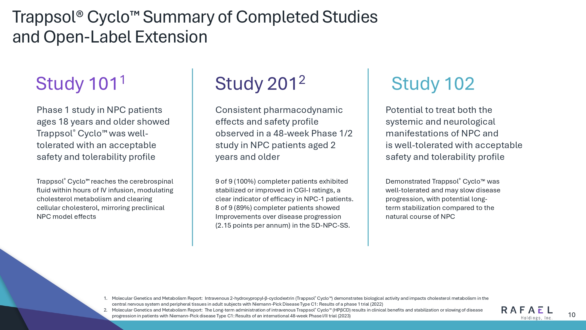 Trappsol® Cyclo Differentiated MOA 9 NPC1, a key regulator in late endosomal/lysosomal compartments, regulates cholesterol efflux Biallelic NPC1 mutations trap cholesterol in lysosomes, block autophagy and drive cell death Trappsol ® Cyclo facilitates cholesterol release independent of NPC1/NPC2, bypassing transport blockades and offering significant potential benefits for NPC patients Uniquely Enables the Effective Transport of Cholesterol Out of Cells Baseline 14 Weeks Baseline 14 Weeks Baseline 14 Weeks Cholesterol as measured by Filipin staining at Baseline and after 7 doses over 14 weeks (3 Patients) 1500 Mg/kg (Mild) Reduction 2500 Mg/kg (Marked) Reduction 2500 Mg/kg (Marked) Reduction