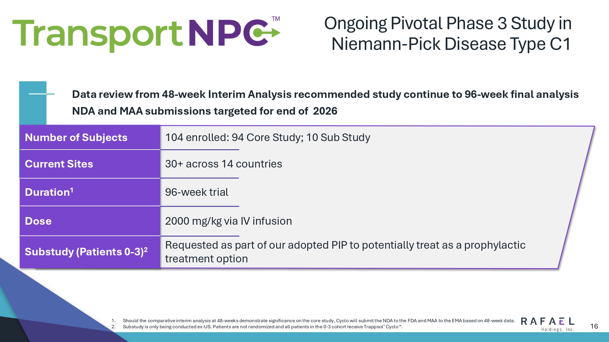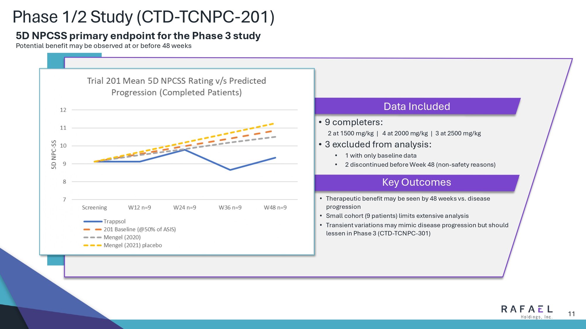 10 Trappsol ® Cyclo Summary of Completed Studies and Open - Label Extension Trappsol ® Cyclo reaches the cerebrospinal fluid within hours of IV infusion, modulating cholesterol metabolism and clearing cellular cholesterol, mirroring preclinical NPC model effects Study 101 1 Study 102 Demonstrated Trappsol ® Cyclo was well - tolerated and may slow disease progression, with potential long - term stabilization compared to the natural course of NPC Study 201 2 Phase 1 study in NPC patients ages 18 years and older showed Trappsol ® Cyclo was well - tolerated with an acceptable safety and tolerability profile Consistent pharmacodynamic effects and safety profile observed in a 48 - week Phase 1/2 study in NPC patients aged 2 years and older Potential to treat both the systemic and neurological manifestations of NPC and is well - tolerated with acceptable safety and tolerability profile 1. Molecular Genetics and Metabolism Report: Intravenous 2 - hydroxypropyl - β - cyclodextrin (Trappsol ® Cyclo ) demonstrates biological activity and impacts cholesterol metabolism in the central nervous system and peripheral tissues in adult subjects with Niemann - Pick Disease Type C1: Results of a phase 1 trial (2 022) 2. Molecular Genetics and Metabolism Report: The Long - term administration of intravenous Trappsol ® Cyclo (HP β CD) results in clinical benefits and stabilization or slowing of disease progression in patients with Niemann - Pick disease Type C1: Results of an international 48 - week Phase I/II trial (2023) 9 of 9 (100%) completer patients exhibited stabilized or improved in CGI - I ratings, a clear indicator of efficacy in NPC - 1 patients. 8 of 9 (89%) completer patients showed Improvements over disease progression (2.15 points per annum) in the 5D - NPC - SS.