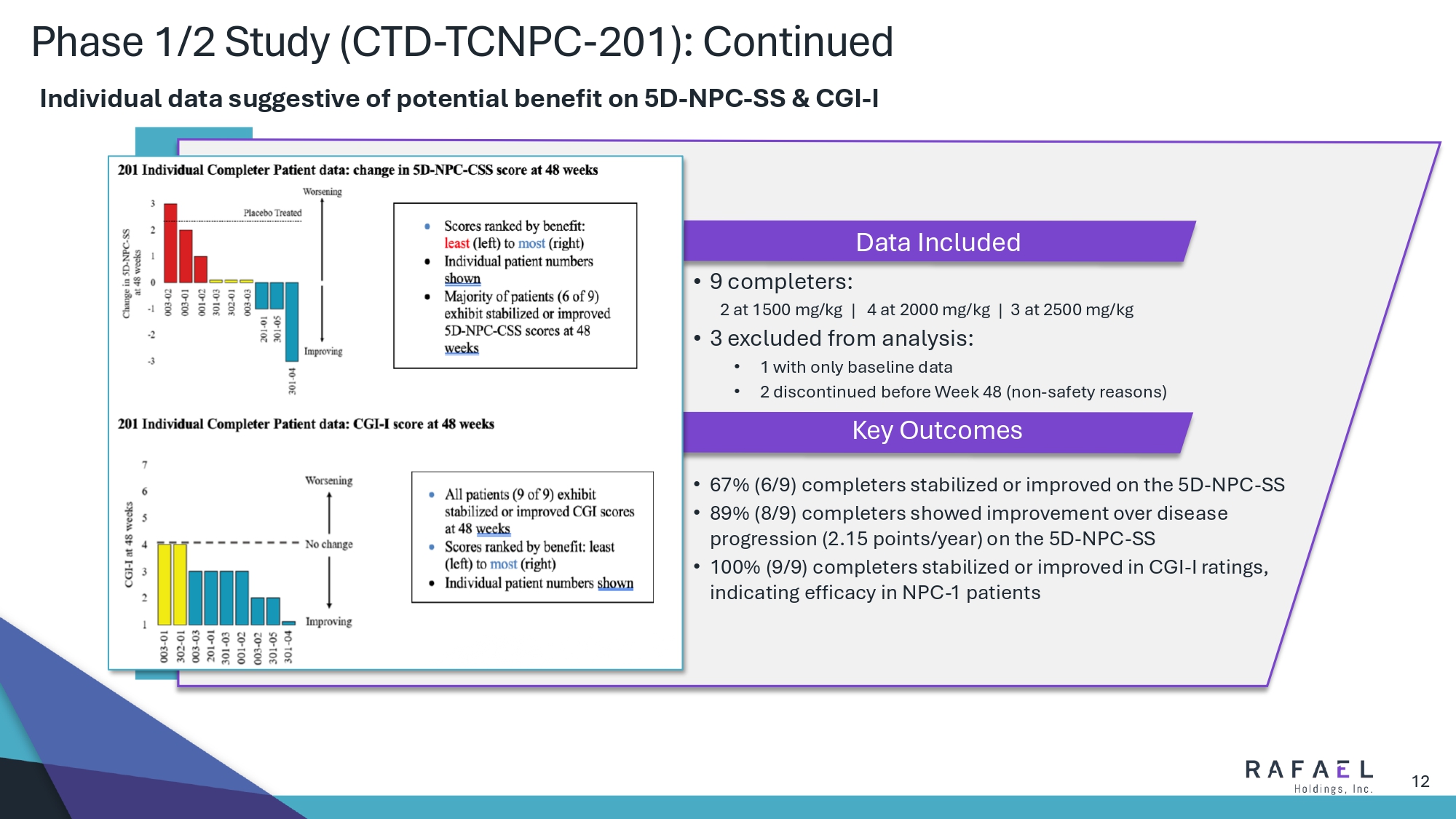 11 Phase 1/2 Study (CTD - TCNPC - 201) • Therapeutic benefit may be seen by 48 weeks vs. disease progression • Small cohort (9 patients) limits extensive analysis • Transient variations may mimic disease progression but should lessen in Phase 3 (CTD - TCNPC - 301) • 9 completers : 2 at 1500 mg/kg | 4 at 2000 mg/kg | 3 at 2500 mg/kg • 3 excluded from analysis : • 1 with only baseline data • 2 discontinued before Week 48 (non - safety reasons) Data Included Key Outcomes 5D NPCSS primary endpoint for the Phase 3 study Potential benefit may be observed at or before 48 weeks