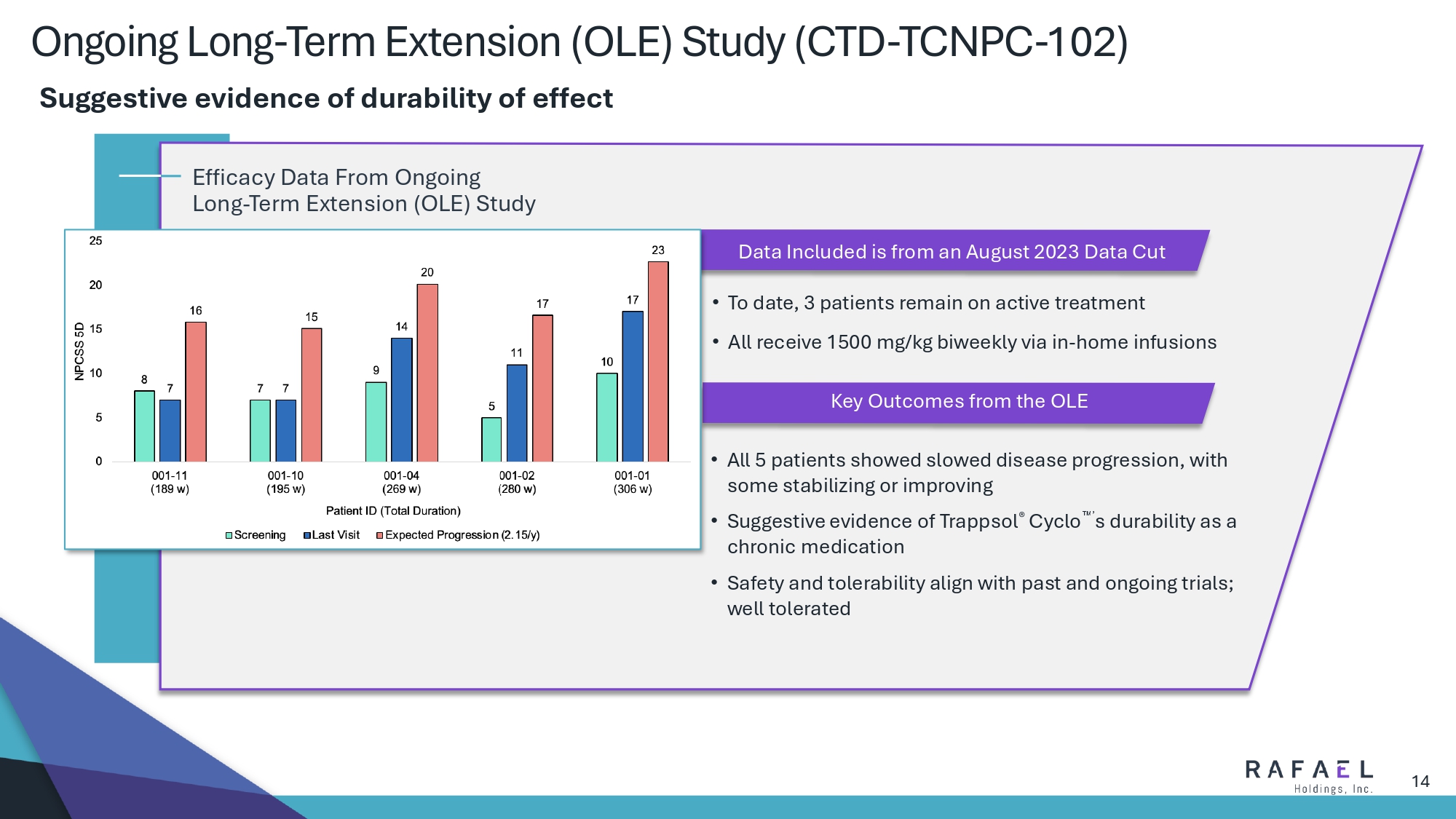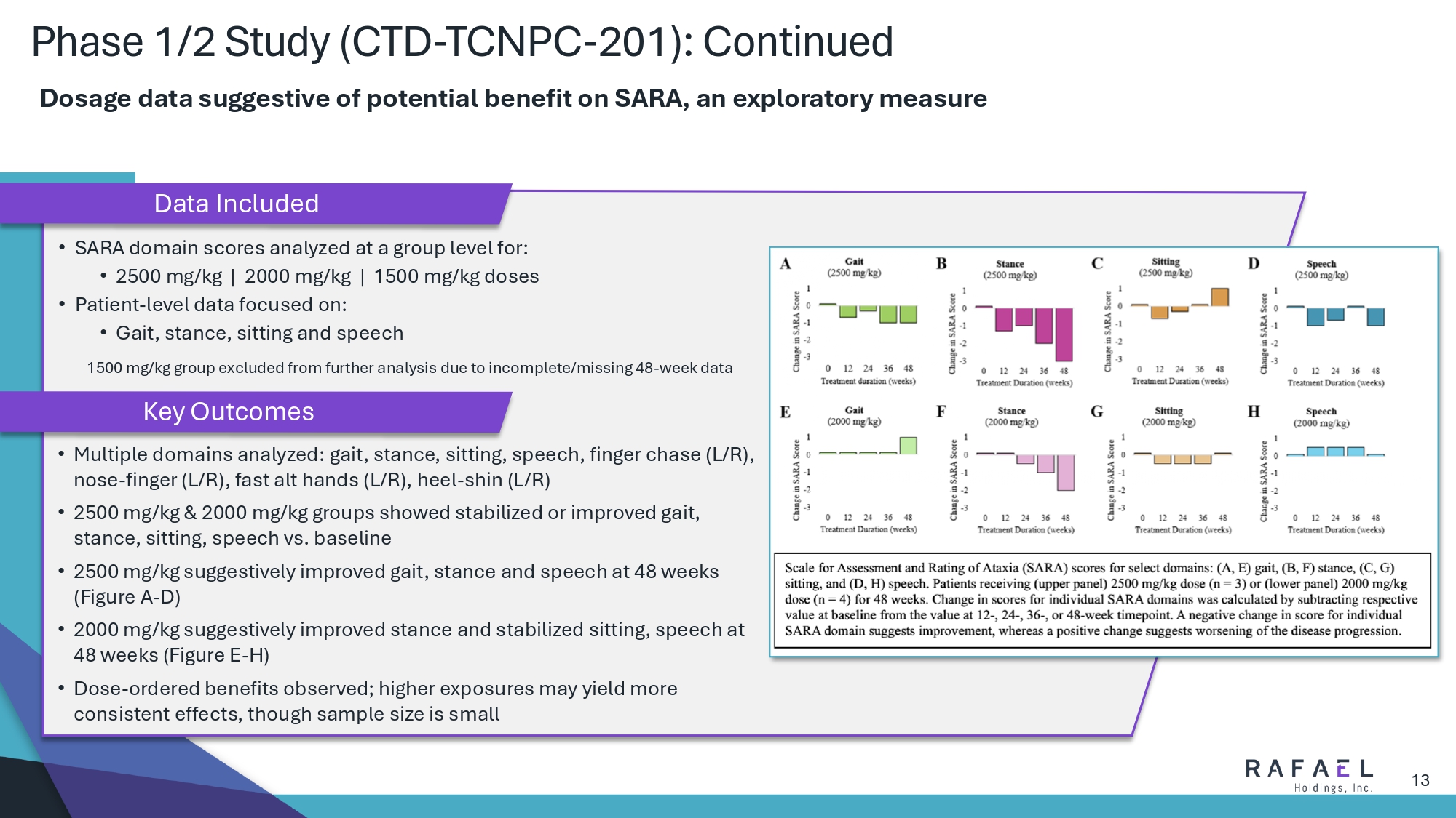 12 Phase 1/2 Study (CTD - TCNPC - 201): Continued • 9 completers : 2 at 1500 mg/kg | 4 at 2000 mg/kg | 3 at 2500 mg/kg • 3 excluded from analysis : • 1 with only baseline data • 2 discontinued before Week 48 (non - safety reasons) Data Included Key Outcomes Individual data suggestive of potential benefit on 5D - NPC - SS & CGI - I • 67% (6/9) completers stabilized or improved on the 5D - NPC - SS • 89% (8/9) completers showed improvement over disease progression (2.15 points/year) on the 5D - NPC - SS • 100% (9/9) completers stabilized or improved in CGI - I ratings, indicating efficacy in NPC - 1 patients