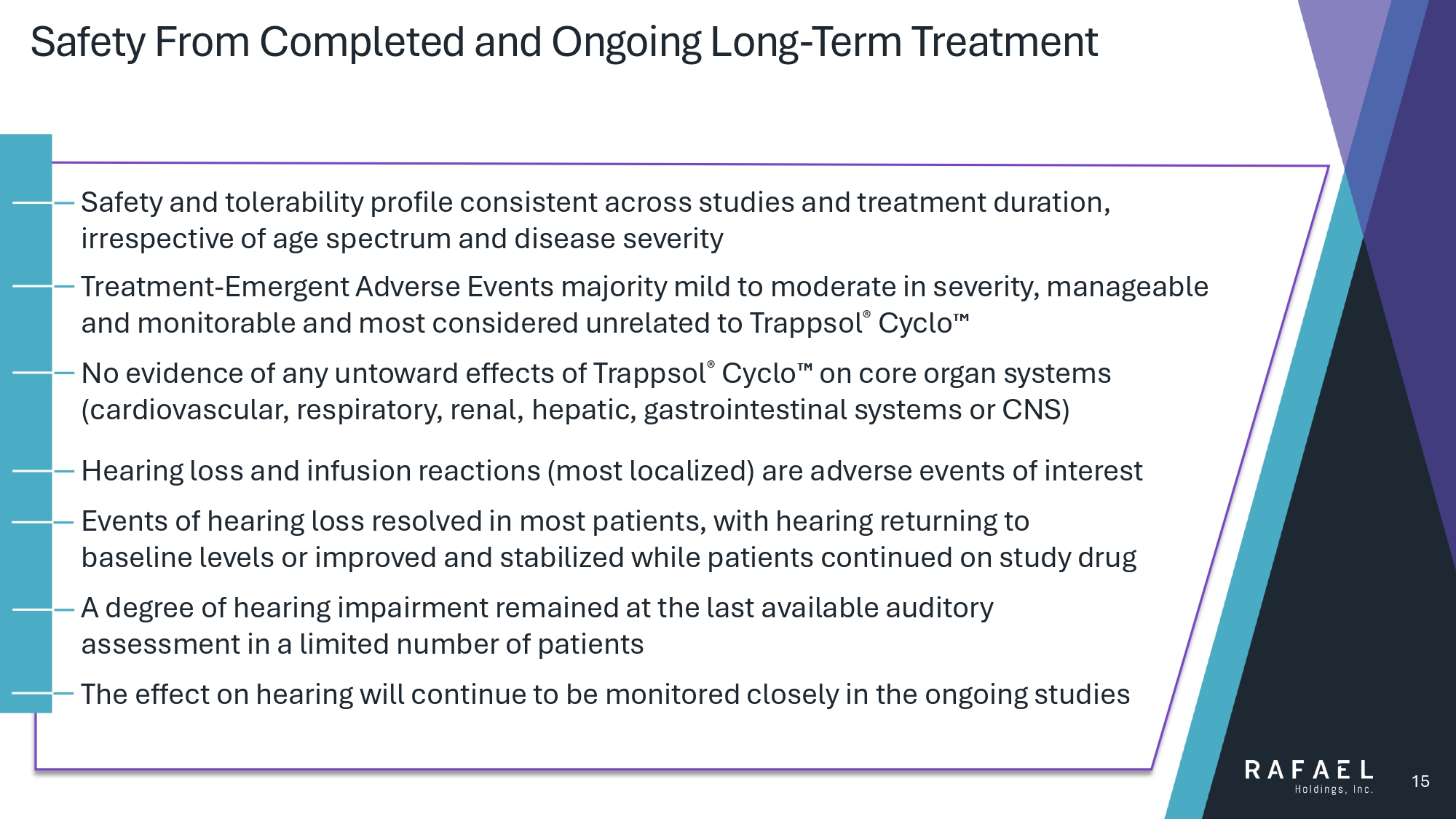 14 Ongoing Long - Term Extension (OLE) Study (CTD - TCNPC - 102) Data Included is from an August 2023 Data Cut Key Outcomes from the OLE • To date, 3 patients remain on active treatment • All receive 1500 mg/kg biweekly via in - home infusions • All 5 patients showed slowed disease progression, with some stabilizing or improving • Suggestive evidence of Trappsol ® Cyclo ’ s durability as a chronic medication • Safety and tolerability align with past and ongoing trials; well tolerated Efficacy Data From Ongoing Long - Term Extension (OLE) Study Suggestive evidence of durability of effect