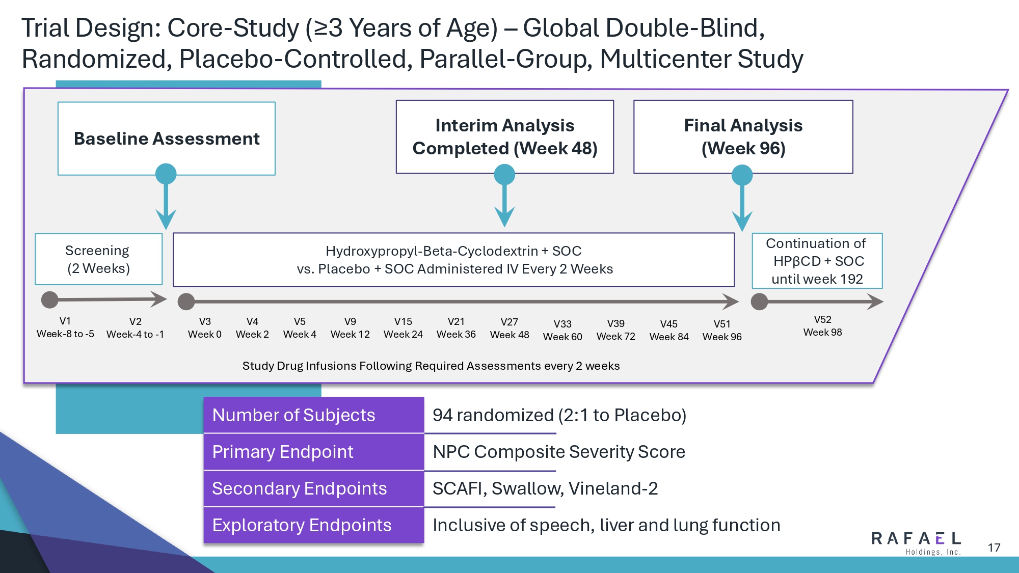 16 Ongoing Pivotal Phase 3 Study in Niemann - Pick Disease Type C1 104 enrolled: 94 Core Study; 10 Sub Study Number of Subjects 30+ across 14 countries Current Sites 96 - week trial Duration 1 2000 mg/kg via IV infusion Dose Requested as part of our adopted PIP to potentially treat as a prophylactic treatment option Substudy (Patients 0 - 3) 2 Data review from 48 - week Interim Analysis recommended study continue to 96 - week final analysis NDA and MAA submissions targeted for end of 2026 1. Should the comparative interim analysis at 48 - weeks demonstrate significance on the core study, Cyclo will submit the NDA to the FDA and MAA to the EMA based on 48 - week data. 2. Substudy is only being conducted ex - US. Patients are not randomized and all patients in the 0 - 3 cohort receive Trappsol ® Cyclo .