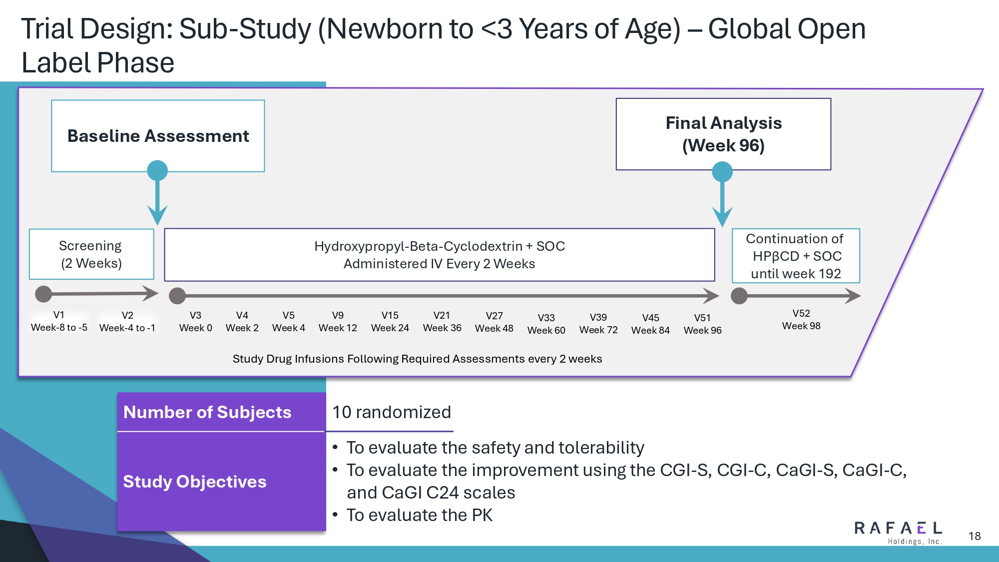 17 Trial Design: Core - Study (≥3 Years of Age) – Global Double - Blind, Randomized, Placebo - Controlled, Parallel - Group, Multicenter Study 94 randomized (2:1 to Placebo) Number of Subjects NPC Composite Severity Score Primary Endpoint SCAFI, Swallow, Vineland - 2 Secondary Endpoints Inclusive of speech, liver and lung function Exploratory Endpoints Baseline Assessment Final Analysis (Week 96) Interim Analysis Completed (Week 48) Screening (2 Weeks) Hydroxypropyl - Beta - Cyclodextrin + SOC vs. Placebo + SOC Administered IV Every 2 Weeks Continuation of HP β CD + SOC until week 192 V1 Week - 8 to - 5 V2 Week - 4 to - 1 V3 Week 0 V4 Week 2 V5 Week 4 V9 Week 12 V15 Week 24 V21 Week 36 V27 Week 48 V33 Week 60 V39 Week 72 V45 Week 84 V51 Week 96 V52 Week 98 Study Drug Infusions Following Required Assessments every 2 weeks
