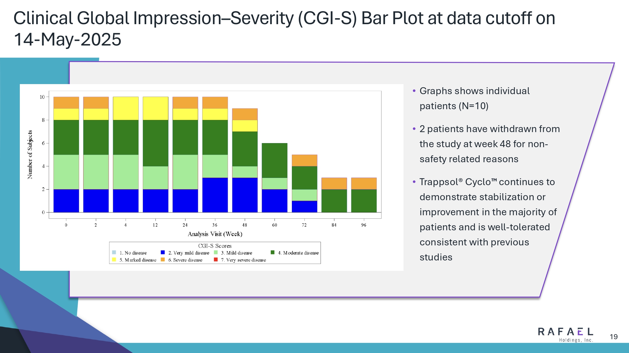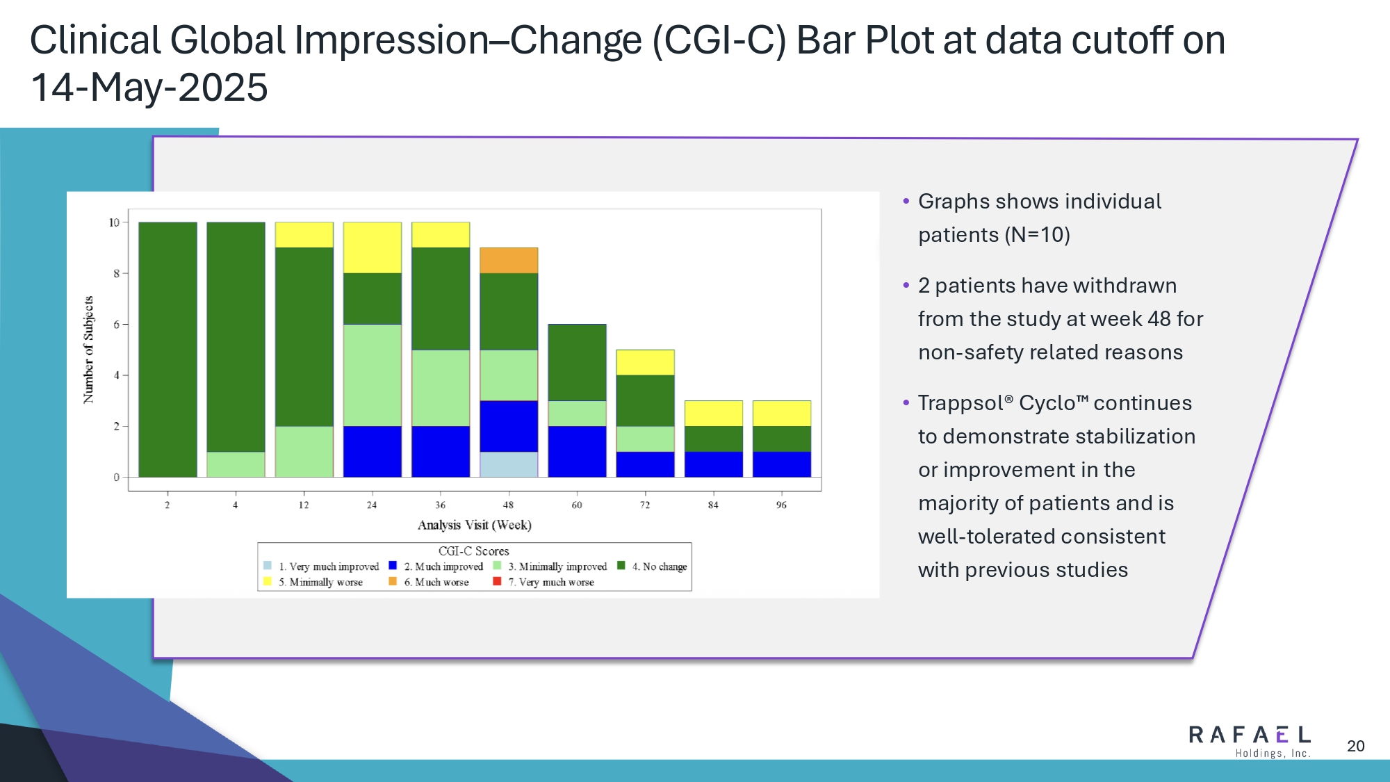 19 Clinical Global Impression – Severity (CGI - S) Bar Plot at data cutoff on 14 - May - 2025 • Graphs shows individual patients (N=10) • 2 patients have withdrawn from the study at week 48 for non - safety related reasons • Trappsol ® Cyclo continues to demonstrate stabilization or improvement in the majority of patients and is well - tolerated consistent with previous studies